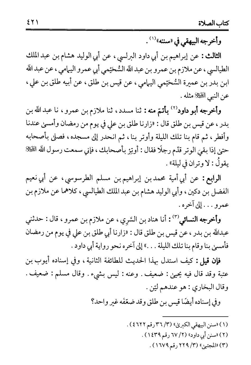 الثالث: عن إبراهيم بن أبي داود البرلسي، عن أبي الوليد هشام بن عبد الملك الطيالسي، عن ملازم بن عمرو بن عبد الله السُّحَيمي أبي عمرو اليمامي، عن عبد الله ابن بدر بن عميرة السُّحَيْمي اليمامي، عن قيس بن طلق، عن أبيه طلق بن علي، عن النبي - عليه السلام - مثله.