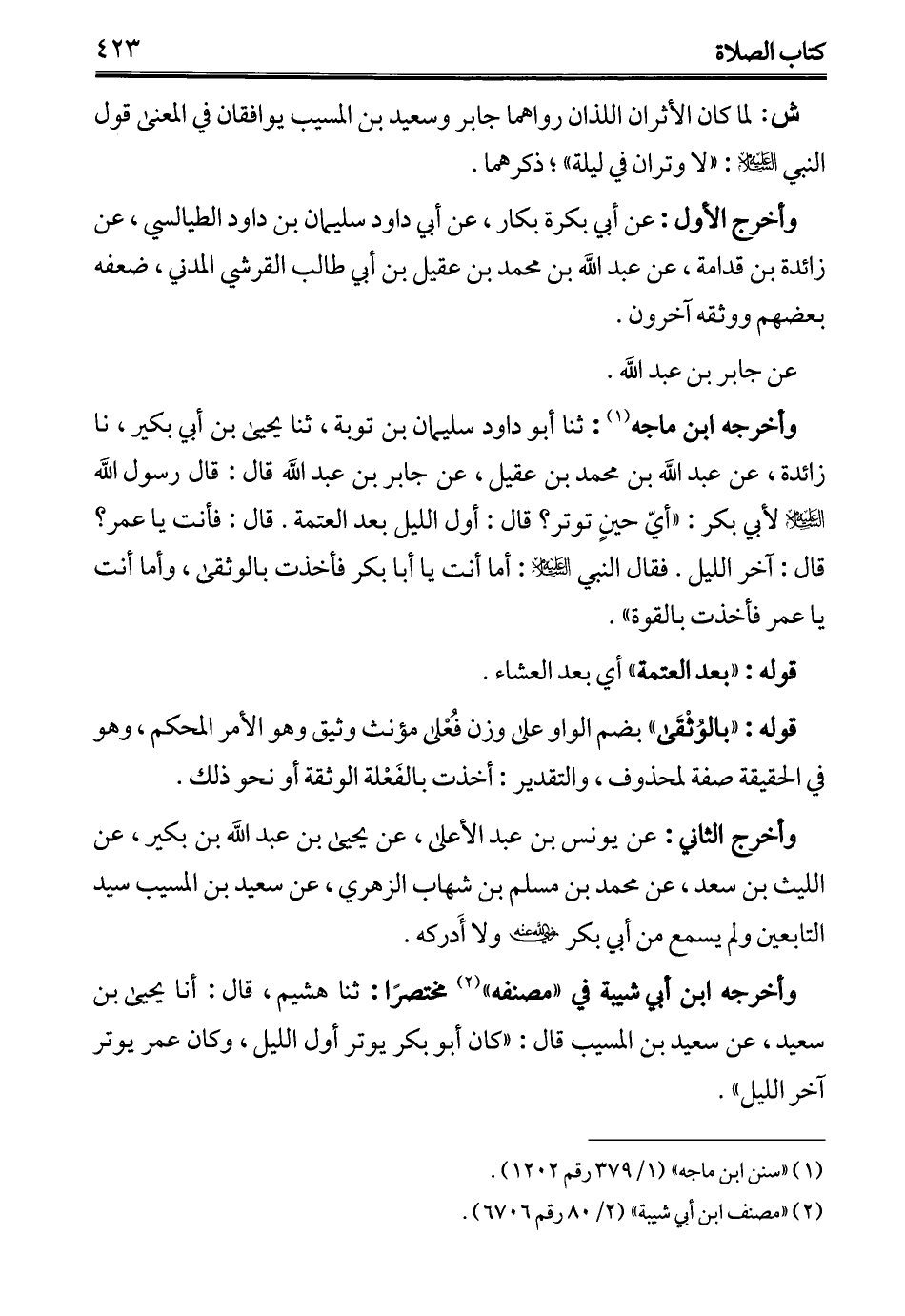 وأخرجه ابن ماجه (¬1): ثنا أبو داود سليمان بن توبة، ثنا يحيى بن أبي بكير، نا زائدة، عن عبد الله بن محمَّد بن عقيل، عن جابر بن عبد الله قال: قال رسول الله - عليه السلام - لأبي بكر: "أيّ حينٍ توتر؟ قال: أول الليل بعد العتمة. قال: فأنت يا عمر؟ قال: آخر الليل. فقال النبي - عليه السلام -: أما أنت يا أبا بكر فأخذت بالوثقى، وأما أنت يا عمر فأخذت بالقوة".