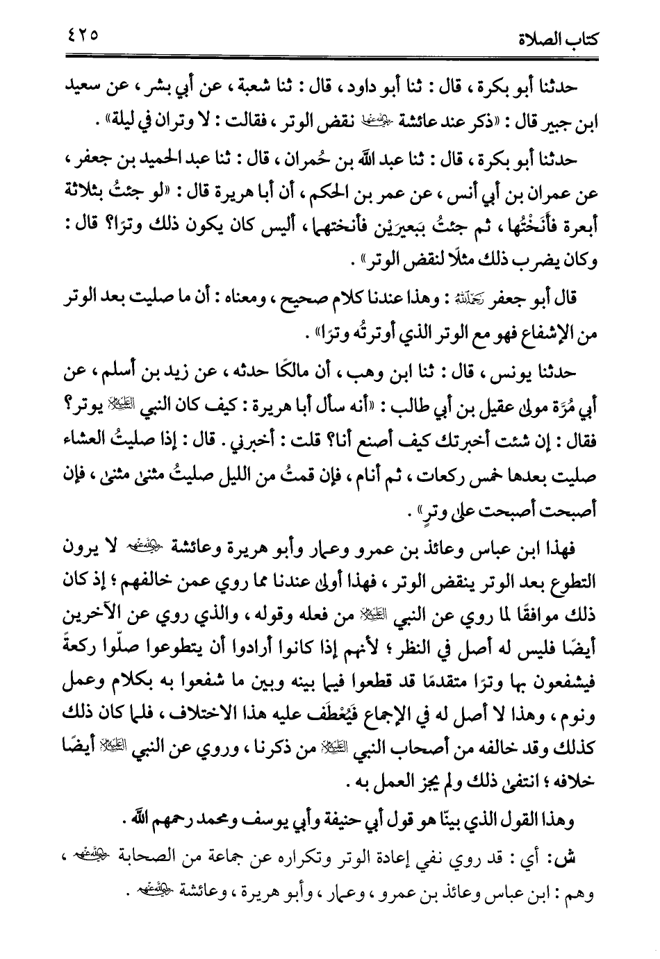 قال أبو جعفر -رحمه الله-: وهذا عندنا كلام صحيح، ومعناه: أن ما صليت بعد الوتر من الإشفاع فهو مع الوتر الذي أوترتُه وترًا". حدثنا يونس، قال: ثنا ابن وهب، أن مالكًا حدثه، عن زيد بن أسلم، عن أبي مُرَّة مولى عقيل بن أبي طالب: "أنه سأل أبا هريرة: كيف كان النبي - عليه السلام - يوتر؟ فقال: إن شئت أخبرتك كيف أصنع أنا؟ قلت: أخبرني. قال: إذا صليتُ العشاء صليت بعدها خمس ركعات، ثم أنام، فإن قمتُ من الليل صليتُ مثنى مثنى، فإن أصبحت أصبحت على وترٍ".