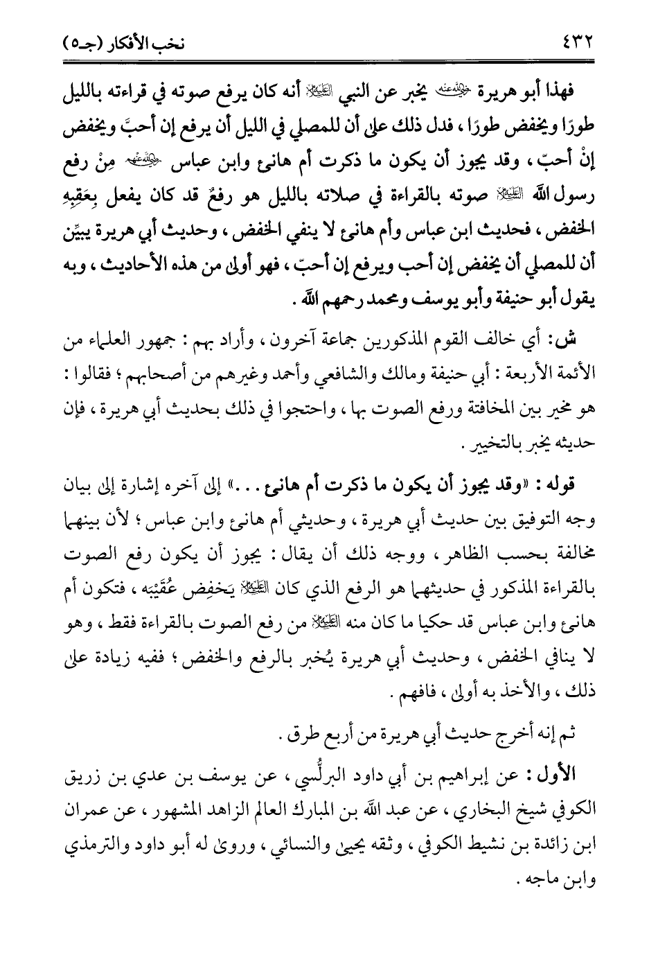 فهذا أبو هريرة - رضي الله عنه - يخبر عن النبي - عليه السلام - أنه كان يرفع صوته في قراءته بالليل طورًا ويخفض طورًا، فدل ذلك على أن للمصلي في الليل أن يرفع إن أحبَّ ويخفض إنْ أحبّ، وقد يجوز أن يكون ما ذكرت أم هانئ وابن عباس - رضي الله عنه - مِنْ رفع رسول الله - عليه السلام - صوته بالقراءة في صلاته بالليل هو رفعٌ قد كان يفعل بِعَقبِهِ الخفض، فحديث ابن عباس وأم هانئ لا ينفي الخفض، وحديث أبي هريرة يبيِّن أن للمصلي أن يخفض إن أحب ويرفع إن أحبّ، فهو أولى من هذه الأحاديث، وبه يقول أبو حنيفة وأبو يوسف ومحمد رحمهم الله.