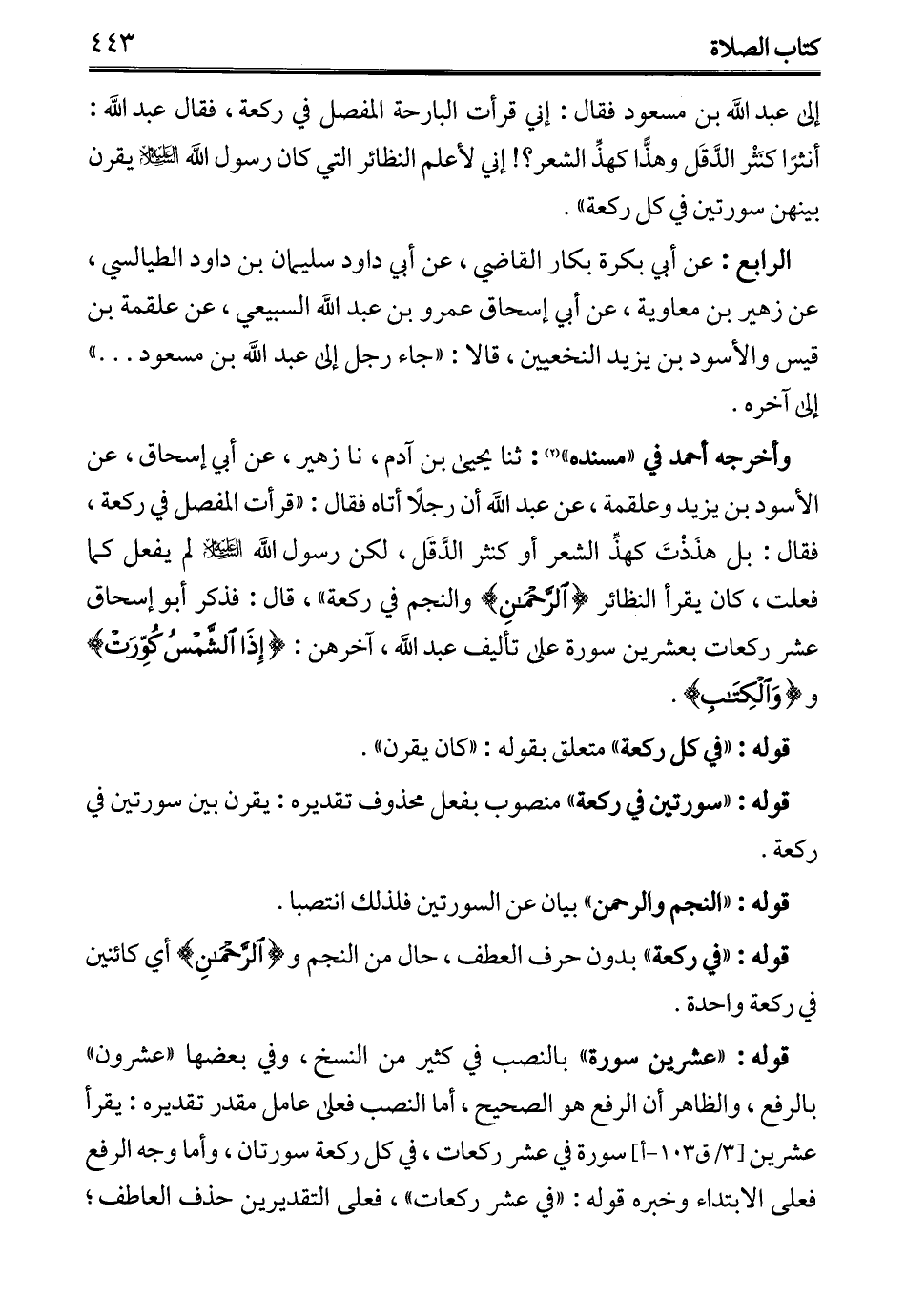 وأخرجه أحمد في "مسنده" (2): ثنا يحيى بن آدم، نا زهير، عن أبي إسحاق، عن الأسود بن يزيد وعلقمة، عن عبد الله أن رجلًا أتاه فقال: "قرأت المفصل في ركعة، فقال: بل هذَذْتَ كهذِّ الشعر أو كنثر الدَّقَل، لكن رسول الله - عليه السلام - لم يفعل كما فعلت، كان يقرأ النظائر {الرَّحْمَنِ} والنجم في ركعة"، قال: فذكر أبو إسحاق عشر ركعات بعشرين سورة على تأليف عبد الله، آخرهن: {إِذَا الشَّمْسُ كُوِّرَتْ} و {وَالْكِتَابِ}.