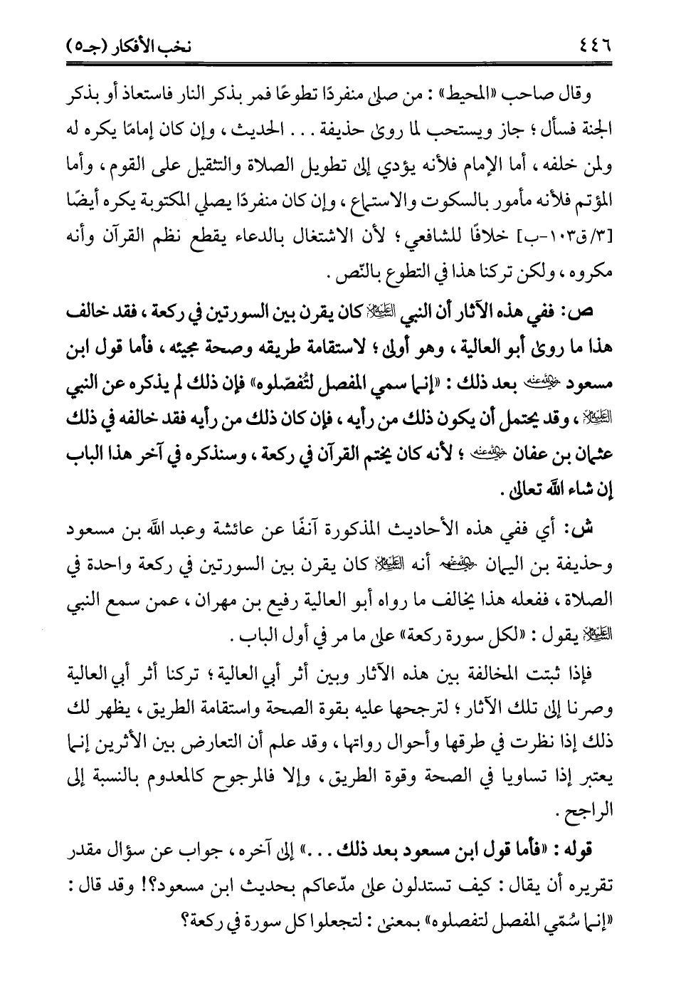 ص: ففي هذه الآثار أن النبي - عليه السلام - كان يقرن بين السورتين في ركعة، فقد خالف هذا ما روى أبو العالية، وهو أولى؛ لاستقامة طريقه وصحة مجيئه، فأما قول ابن مسعود - رضي الله عنه - بعد ذلك: "إنما سمي المفصل لتُفصّلوه" فإن ذلك لم يذكره عن النبي - عليه السلام -، وقد يحتمل أن يكون ذلك من رأيه، فإن كان ذلك من رأيه فقد خالفه في ذلك عثمان بن عفان - رضي الله عنه -؛ لأنه كان يختم القرآن في ركعة، وسنذكره في آخر هذا الباب إن شاء الله تعالى.