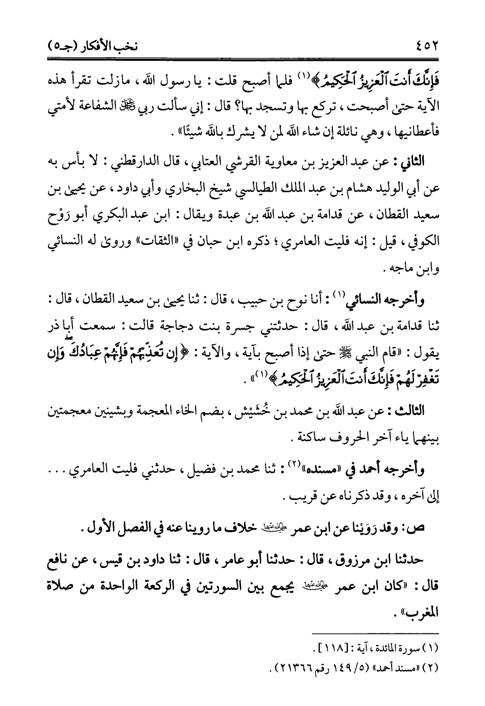 وأخرجه النسائي (1): أنا نوح بن حبيب، قال: ثنا يحيى بن سعيد القطان، قال: ثنا قدامة بن عبد الله، قال: حدثتني جسرة بنت دجاجة قالت: سمعت أبا ذر يقول: "قام النبي - صلى الله عليه وسلم - حتى إذا أصبح بآية، والآية: {إِنْ تُعَذِّبْهُمْ فَإِنَّهُمْ عِبَادُكَ وَإِنْ تَغْفِرْ لَهُمْ فَإِنَّكَ أَنْتَ الْعَزِيزُ الْحَكِيمُ} (1) ".