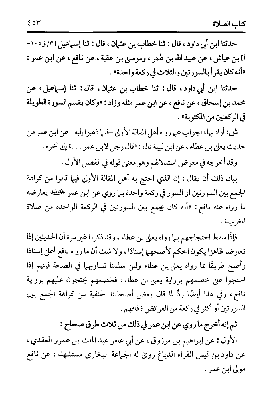 حدثنا ابن أبي داود، قال: ثنا خطاب بن عثمان، قال: ثنا إسماعيل بن عياش، عن عبيد الله بن عُمَر، وموسى بن عقبة، عن نافع، عن ابن عمر: "أنه كان يقرأ بالسورتين والثلاث في ركعة واحدة".