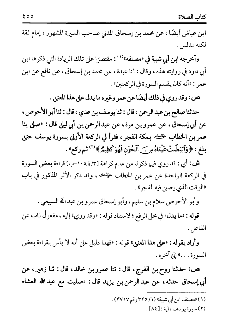 حدثنا صالح بن عبد الرحمن، قال: ثنا يوسف بن عدي، قال: ثنا أبو الأحوص، عن أبي إسحاق، عن عمرو بن مرة، عن عبد الرحمن بن أبي ليلى قال: "صلى بنا عمر بن الخطاب - رضي الله عنه - بمكة الفجر، فقرأ في الركعة الأول بسورة يوسف حتى بلغ: {وَابْيَضَّتْ عَيْنَاهُ مِنَ الْحُزْنِ فَهُوَ كَظِيمٌ} (¬2) ثم ركع".