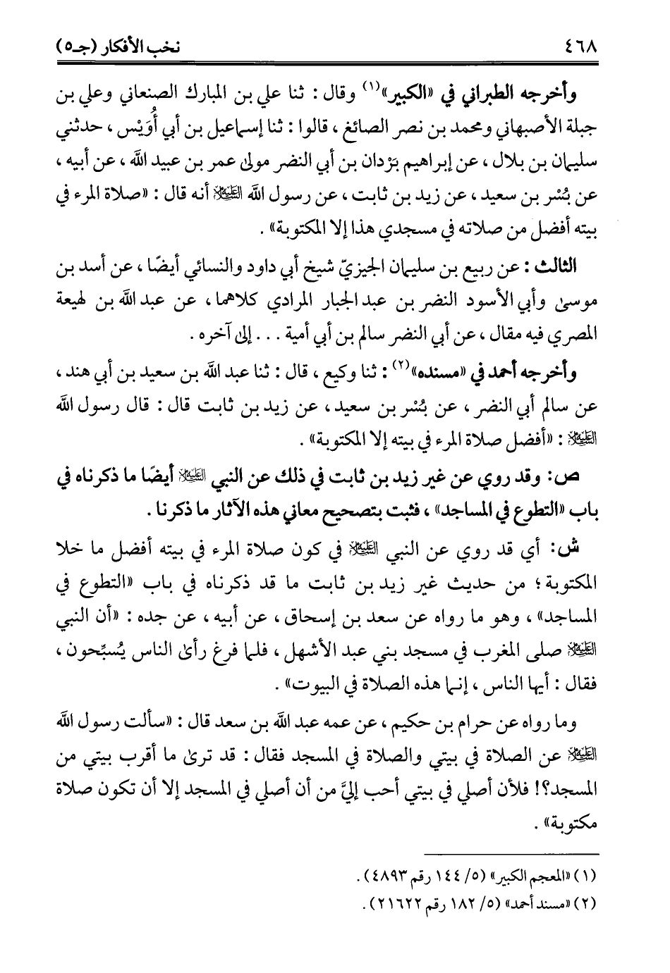 ص: وقد روي عن غير زيد بن ثابت في ذلك عن النبي - عليه السلام - أيضًا ما ذكرناه في باب "التطوع في المساجد"، فثبت بتصحيح معاني هذه الآثار ما ذكرنا.