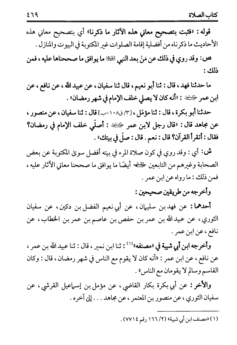 ما حدثنا فهد، قال: ثنا أبو نعيم، قال ثنا سفيان، عن عبيد الله، عن نافع، عن ابن عمر - رضي الله عنه -: "أنه كان لا يصلي خلف الإِمام في شهر رمضان".
