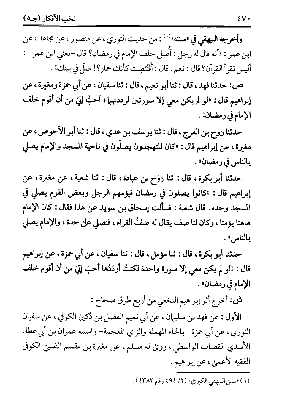 ص: حدثنا فهد، قال: ثنا أبو نعيم، قال: ثنا سفيان، عن أبي حمزة ومغيرة، عن إبراهيم قال: "لو لم يكن معي إلا سورتين لرددتهما؛ أحبُّ إليّ من أن أقوم خلف الإِمام في رمضان".