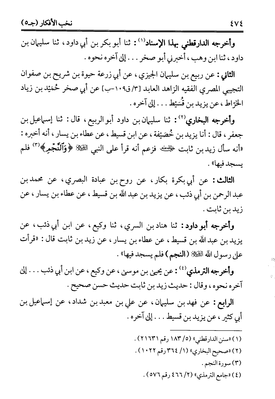 وأخرجه البخاري (¬2): ثنا سليمان بن داود أبو الربيع، قال: ثنا إسماعيل بن جعفر، قال: أنا يزيد بن خُصَيْفة، عن ابن قسيط، عن عطاء بن يسار، أنه أخبره: "أنه سأل زيد بن ثابت - رضي الله عنه - فزعم أنه قرأ على النبي - عليه السلام - {وَالنَّجْمِ} (¬3) فلم يسجد فيها".
