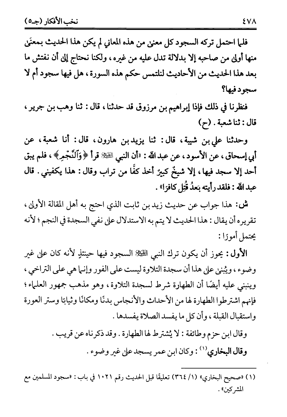 ش: هذا جواب عن حديث زيد بن ثابت الذي احتج به أهل المقالة الأولى، تقريره أن يقال: هذا الحديث لا يتم به الاستدلال على نفي السجدة في النجم؛ لأنه يحتمل أمورًا: