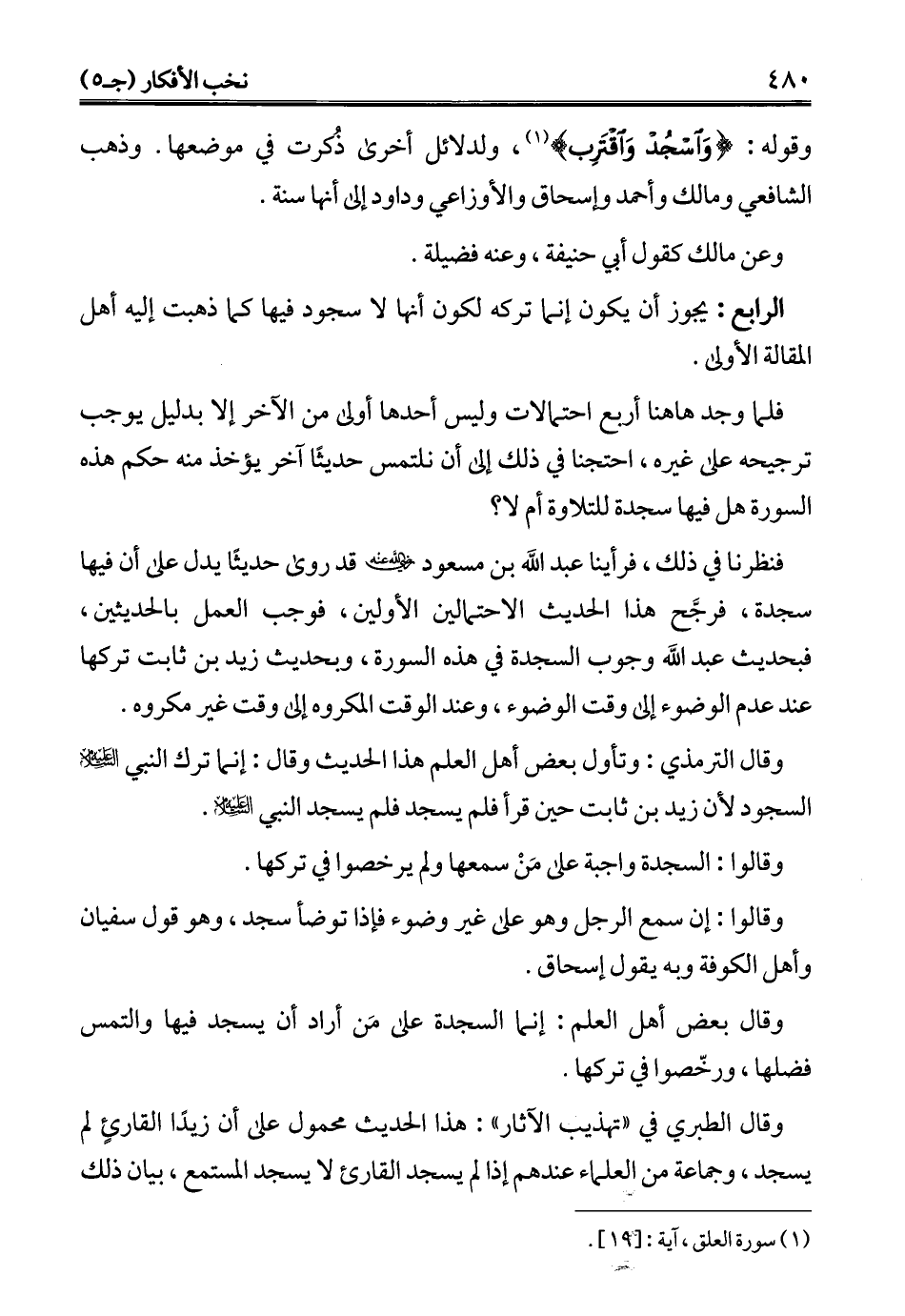فنظرنا في ذلك، فرأينا عبد الله بن مسعود - رضي الله عنه - قد روى حديثًا يدل على أن فيها سجدة، فرجَّح هذا الحديث الاحتمالين الأولين، فوجب العمل بالحديثين، فبحديث عبد الله وجوب السجدة في هذه السورة، وبحديث زيد بن ثابت تركها عند عدم الوضوء إلى وقت الوضوء، وعند الوقت المكروه إلى وقت غير مكروه.