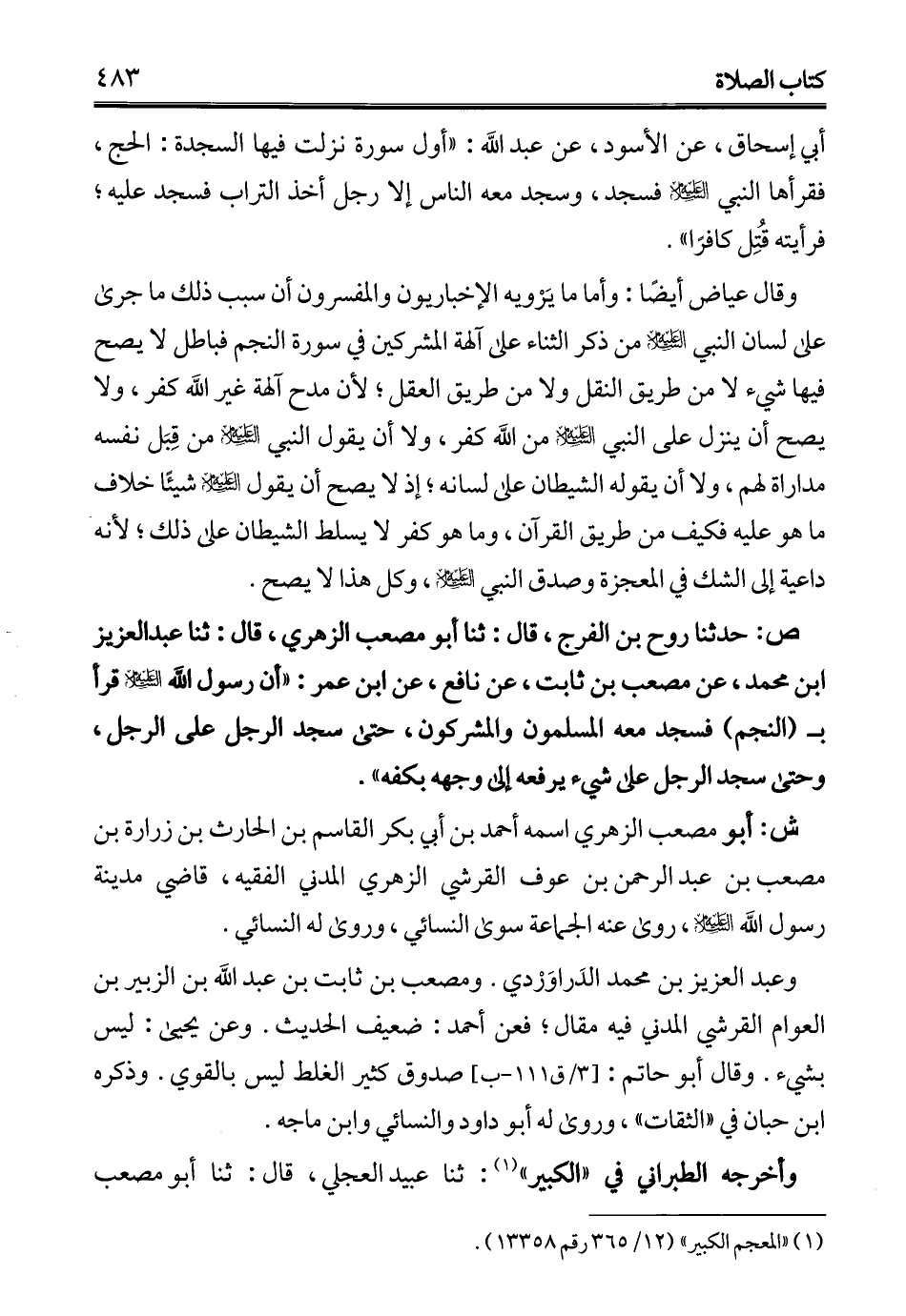 ص: حدثنا روح بن الفرج، قال: ثنا أبو مصعب الزهري، قال: ثنا عبد العزيز ابن محمَّد، عن مصعب بن ثابت، عن نافع، عن ابن عمر: "أن رسول الله - عليه السلام - قرأ بـ (النجم) فسجد معه المسلمون والمشركون، حتى سجد الرجل على الرجل، وحتى سجد الرجل على شيء يرفعه إلى وجهه بكفه".