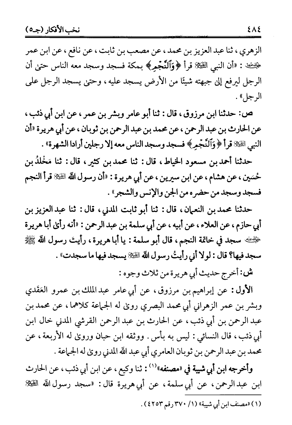 حدثنا محمَّد بن النعمان، قال: ثنا أبو ثابت المدني، قال: ثنا عبد العزيز بن أبي حازم، عن العلاء، عن أبيه، عن أبي سلمة بن عبد الرحمن: "أنه رأى أبا هريرة - رضي الله عنه - سجد في خاتمة النجم، قال أبو سلمة: يا أبا هريرة، رأيتَ رسول الله - صلى الله عليه وسلم - سجد فيها؟ قال: لولا أني رأيتُ رسول الله - عليه السلام - يسجد فيها ما سجدت".