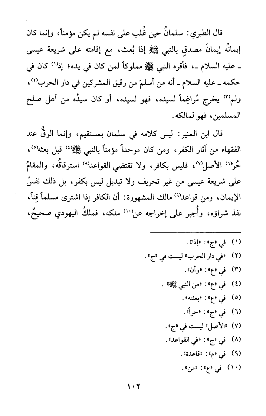 قال الطبري: سلمانُ حين غُلب على نفسه لم يكن مؤمناً، وإنما كان إيمانُه إيمانَ مصدقٍ للنبي - صلى الله عليه وسلم - إذا بُعث، مع إقامته على شريعة عيسى -عليه السلام-، فأقره النبي - صلى الله عليه وسلم - مملوكاً لمن كان في يده؛ إذا (¬1) كان في حكمه -عليه السلام- أنه من أسلمَ من رقيق المشركين في دار الحرب (¬2)، ولم (¬3) يخرج مُراغِماً لسيده، فهو لسيده، أو كان سيدُه من أهل صلح المسلمين، فهو لمالكه.