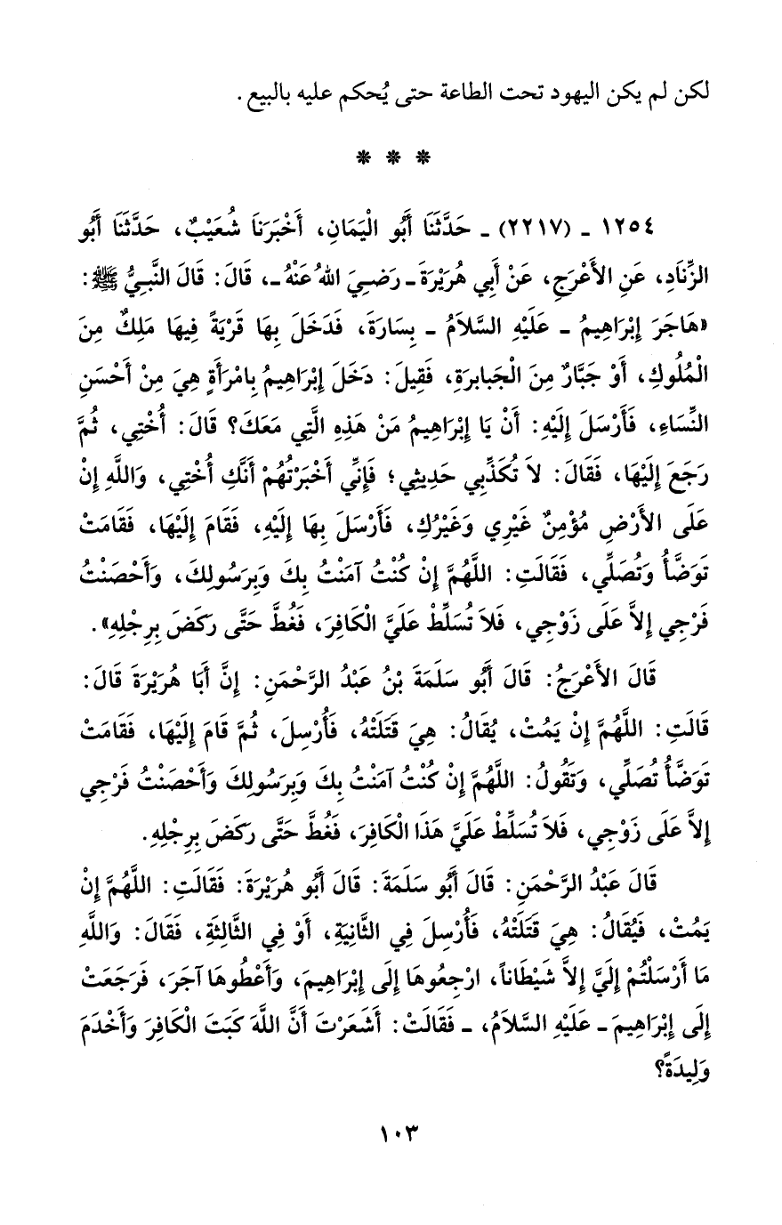 1254 - (2217) - حَدَّثَنَا أَبُو الْيَمَانِ، أَخْبَرَناَ شُعَيْبٌ، حَدَّثَنَا أَبُو الزِّناَدِ، عَنِ الأَعْرَجِ، عَنْ أَبي هُرَيْرَةَ -رَضِيَ اللهُ عَنْهُ-، قَالَ: قَالَ النَّبِيُّ - صلى الله عليه وسلم - "هَاجَرَ إِبْرَاهِيمُ -عَلَيْهِ السَّلاَمُ- بِسَارَةَ، فَدَخَلَ بِهَا قَرْيَةً فِيهَا مَلِكٌ مِنَ الْمُلُوكِ، أَوْ جَبَّارٌ مِنَ الْجَبابرَةِ، فَقِيلَ: دَخَلَ إِبْرَاهِيمُ بِامْرَأَةٍ هِيَ مِنْ أَحْسَنِ النِّسَاءَ، فَأَرْسَلَ إِلَيْهِ: أَنْ يَا إِبْرَاهِيمُ مَنْ هَذِهِ الَّتِي مَعَكَ؟ قَالَ: أُخْتِي، ثُمَّ رَجَعَ إِلَيْهَا، فَقَالَ: لاَ تُكَذِّبِي حَدِيثِي؛ فَإِنِّي أَخْبَرْتُهُمْ أَنَّكِ أُخْتِي، وَاللهِ إِنْ عَلَى الأَرْضِ مُؤْمِنٌ غَيْرِي وَغَيْرُكِ، فَأَرْسَلَ بِهَا إِلَيْهِ، فَقَامَ إِلَيْهَا، فَقَامَتْ تَوَضَّأُ وَتُصَلِّي، فَقَالَتِ: اللَّهُمَّ إِنْ كُنْتُ آمَنْتُ بِكَ وَبِرَسُولِكَ، وَأَحْصَنْتُ فَرْجِي إِلاَّ عَلَى زَوْجِي، فَلاَ تُسَلِّطْ عَلَيَّ الْكَافِرَ، فَغُطَّ حَتَّى رَكَضَ بِرِجْلِهِ".
