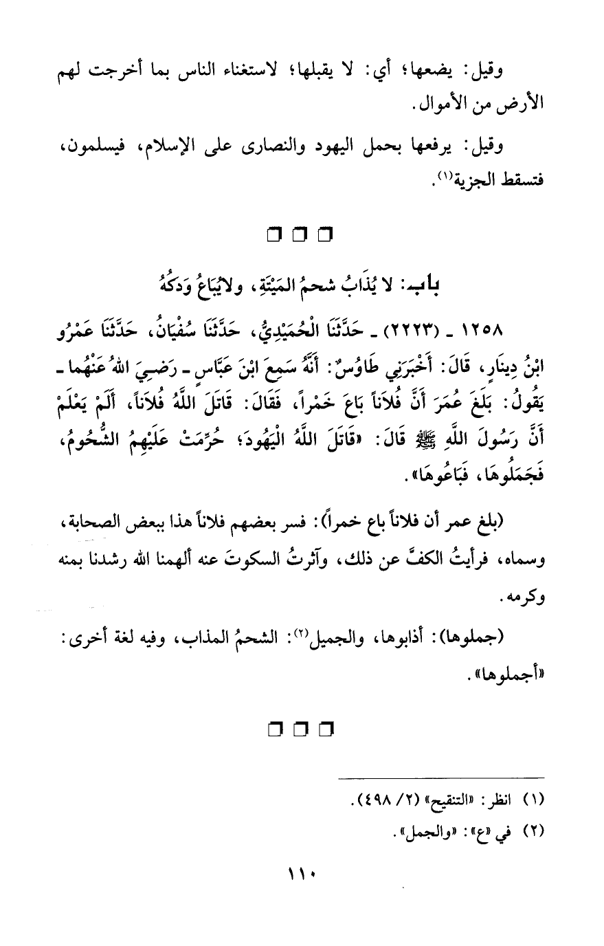 1258 - (2223) - حَدَّثَنَا الْحُمَيْدِيُّ، حَدَّثَنَا سُفْيَانُ، حَدَّثَنَا عَمْرُو ابْنُ دِينَارٍ، قَالَ: أَخْبَرَنِي طَاوُسٌ: أَنَّهُ سَمِعَ ابْنَ عَبَّاسٍ -رَضِيَ اللهُ عَنْهُما- يَقُولُ: بَلَغَ عُمَرَ أَنَّ فُلاَناً بَاعَ خَمْراً، فَقَالَ: قَاتَلَ اللهُ فُلاَناً، أَلَمْ يَعْلَمْ أَنَّ رَسُولَ اللهِ - صلى الله عليه وسلم - قَالَ: "قَاتَلَ اللهُ الْيَهُودَ؛ حُرِّمَتْ عَلَيْهِمُ الشُّحُومُ، فَجَمَلُوهَا، فَبَاعُوهَا".