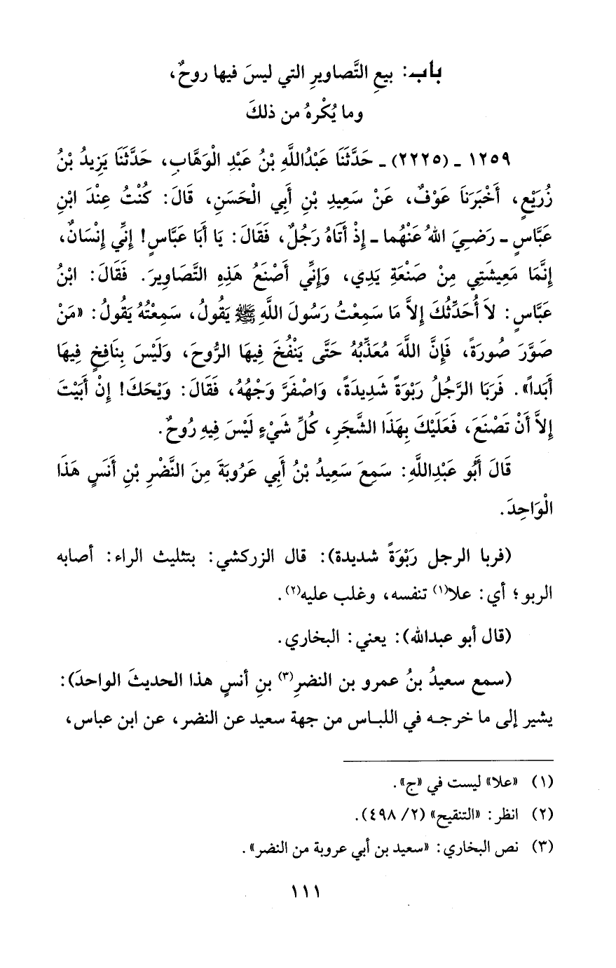 1259 - (2225) - حَدَّثَنَا عَبْدُ اللهِ بْنُ عَبْدِ الْوَهَّابِ، حَدَّثَنَا يَزِيدُ بْنُ زُرَيْعٍ، أَخْبَرَناَ عَوْفٌ، عَنْ سَعِيدِ بْنِ أَبِي الْحَسَنِ، قَالَ: كُنْتُ عِنْدَ ابْنِ عَبَّاسٍ -رَضِيَ اللهُ عَنْهُما- إِذْ أَتَاهُ رَجُلٌ، فَقَالَ: يَا أَبَا عَبَّاسٍ! إِنِّي إِنْسَانٌ، إِنَّمَا مَعِيشَتِي مِنْ صَنْعَةِ يَدِي، وَإِنِّي أَصْنَعُ هَذِهِ التَّصَاوِيرَ. فَقَالَ: ابْنُ عَبَّاسٍ: لاَ أُحَدِّثُكَ إِلاَّ مَا سَمِعْتُ رَسُولَ اللهِ - صلى الله عليه وسلم - يَقُولُ، سَمِعْتُهُ يَقُولُ: "مَنْ صَوَّرَ صُورَةً، فَإِنَّ اللهَ مُعَذِّبُهُ حَتَّى يَنْفُخَ فِيهَا الرُّوحَ، وَلَيْسَ بِنَافِخٍ فِيهَا أَبَداً". فَرَبَا الرَّجُلُ رَبْوَةً شَدِيدَةً، وَاصْفَرَّ وَجْهُهُ، فَقَالَ: وَيْحَكَ! إِنْ أَبَيْتَ إِلاَّ أَنْ تَصْنَعَ، فَعَلَيْكَ بِهَذَا الشَّجَرِ، كُلِّ شَيْءٍ لَيْسَ فِيهِ رُوحٌ.
