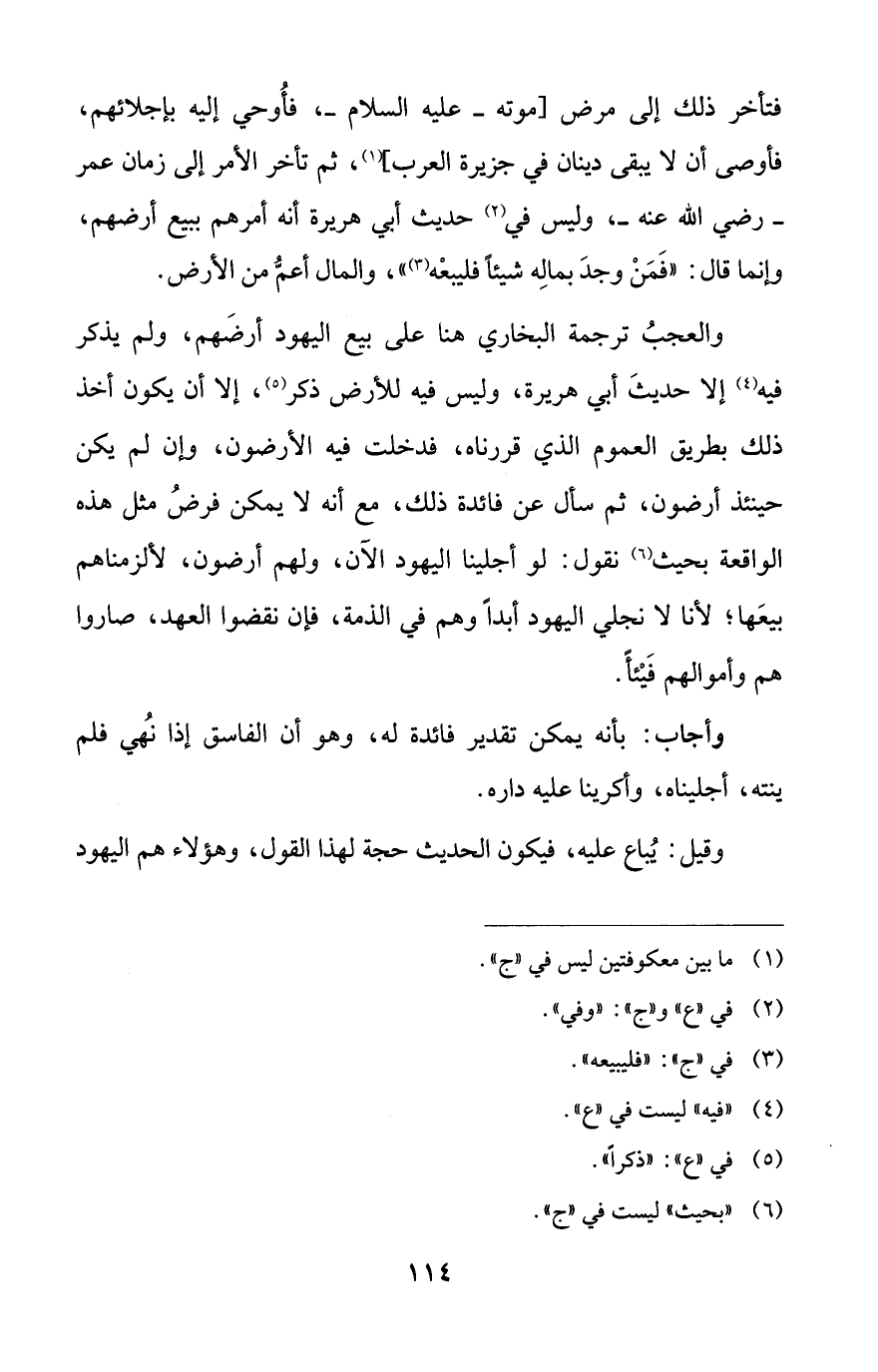 والعجبُ ترجمة البخاري هنا على بيع اليهود أرضَهم، ولم يذكر فيه (¬4) إلا حديثَ أبي هريرة، وليس فيه للأرض ذكر (¬5)، إلا أن يكون أخذ ذلك بطريق العموم الذي قررناه، فدخلت فيه الأرضون، وإن لم يكن حينئذ أرضون، ثم سأل عن فائدة ذلك، مع أنه لا يمكن فرضُ مثل هذه الواقعة بحيث (¬6) نقول: لو أجلينا اليهود الآن، ولهم أرضون، لألزمناهم بيعَها؛ لأنا لا نجلي اليهود أبداً وهم في الذمة، فإن نقضوا العهد، صاروا هم وأموالهم فَيْئاً.