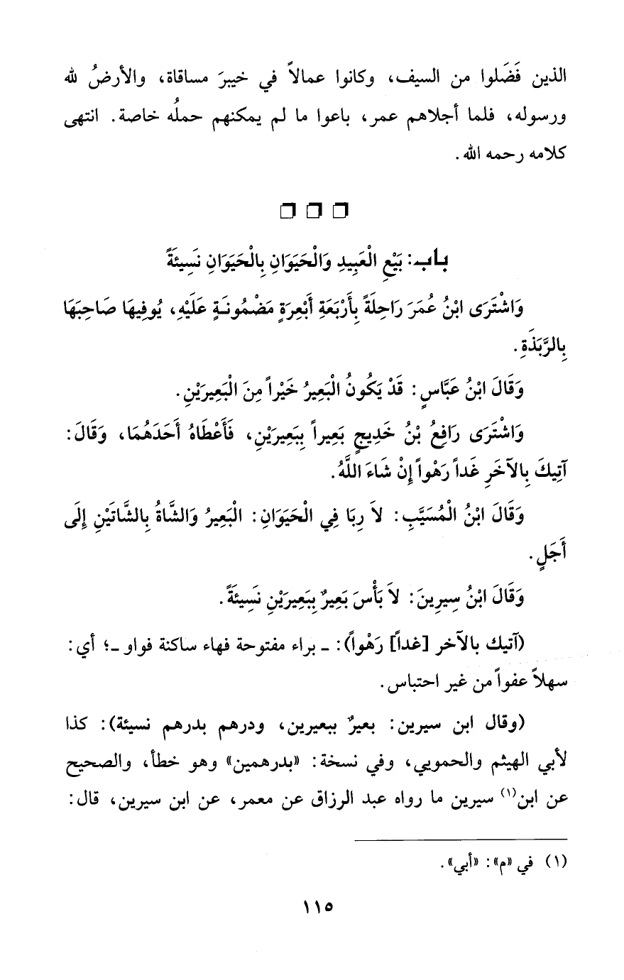 وَاشْتَرَى ابْنُ عُمَرَ رَاحِلَةً بِأَرْبَعَةِ أَبْعِرَةٍ مَضْمُونَةٍ عَلَيْهِ، يُوفِيهَا صَاحِبَهَا بِالرَّبَذَةِ.