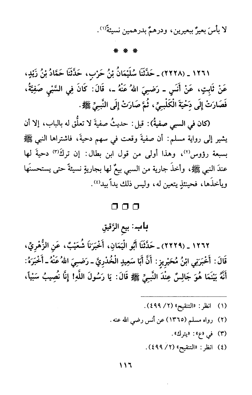 1261 - (2228) - حَدَّثَنَا سُلَيْمَانُ بْنُ حَرْبٍ، حَدَّثَنَا حَمَّادُ بْنُ زَيْدٍ، عَنْ ثَابِتٍ، عَنْ أَنسٍ -رَضِيَ اللهُ عَنْهُ-، قَالَ: كَانَ فِي السَّبْيِ صَفِيَّةُ، فَصَارَتْ إِلَى دَحْيَةَ الْكَلْبِيِّ، ثُمَّ صَارَتْ إِلَى النَّبِيِّ - صلى الله عليه وسلم -.