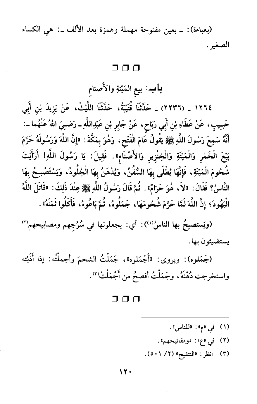 1264 - (2236) - حَدَّثَنَا قُتَيْبَةُ، حَدَّثَنَا اللَّيْثُ، عَنْ يَزِيدَ بْنِ أَبِي حَبِيبٍ، عَنْ عَطَاءِ بْنِ أَبِي رَبَاحٍ، عَنْ جَابِرِ بْنِ عَبْدِ اللهِ -رَضِيَ اللهُ عَنْهُما-: أَنَّهُ سَمِعَ رَسُولَ اللهِ - صلى الله عليه وسلم - يَقُولُ عَامَ الْفَتْحِ، وَهُوَ بِمَكَّةَ: "إِنَّ اللهَ وَرَسُولَهُ حَرَّمَ بَيْعِ الْخَمْرِ وَالْمَيْتَةِ وَالْخِنْزِيرِ وَالأَصْنَامِ". فَقِيلَ: يَا رَسُولَ اللهِ! أَرَأَيْتَ شُحُومَ الْمَيْتَةِ، فَإِنَّهَا يُطْلَى بِهَا السُّفُنُ، وَيُدْهَنُ بِهَا الْجُلُودُ، وَيَسْتَصْبحُ بِهَا النَّاسُ؟ فَقَالَ: "لاَ، هُوَ حَرامٌ". ثُمَّ قَالَ رَسُولُ اللهِ - صلى الله عليه وسلم - عِنْدَ ذَلِكَ: "قَاتَلَ اللهُ الْيَهُودَ؛ إِنَّ اللهَ لَمَّا حَرَّمَ شُحُومَهَا، جَمَلُوهُ، ثُمَّ بَاعُوهُ، فَأَكَلُوا ثَمَنَهُ".