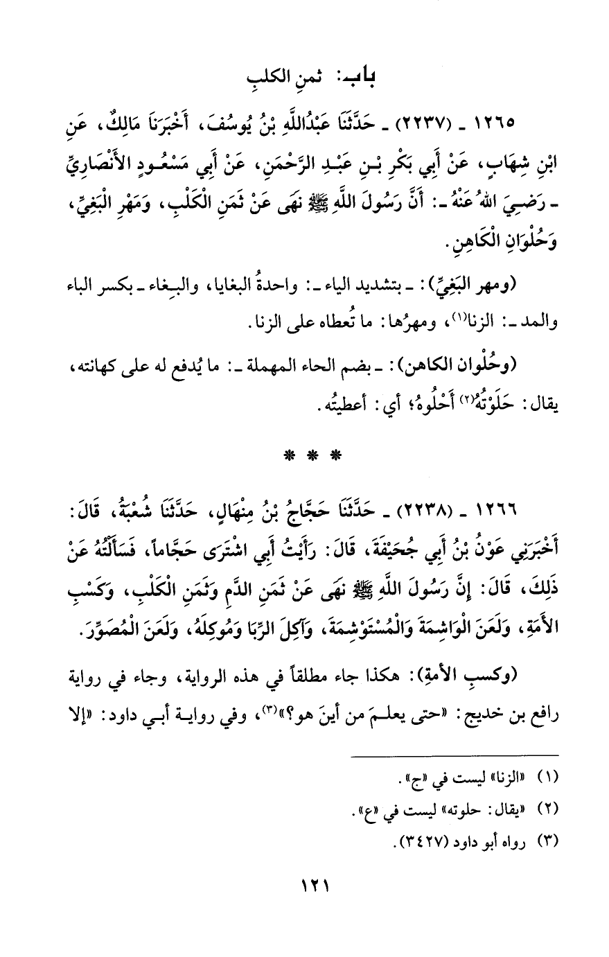 1265 - (2237) - حَدَّثَنَا عَبْدُ اللَّهِ بْنُ يُوسُفَ، أَخْبَرَناَ مَالِكٌ، عَنِ ابْنِ شِهَابٍ، عَنْ أَبِي بَكْرِ بْنِ عَبْدِ الرَّحْمَنِ، عَنْ أَبِي مَسْعُودٍ الأَنْصَارِيِّ -رَضِيَ اللهُ عَنْهُ-: أَنَّ رَسُولَ اللهِ - صلى الله عليه وسلم - نَهَى عَنْ ثَمَنِ الْكَلْبِ، وَمَهْرِ الْبَغِيِّ، وَحُلْوَانِ الْكَاهِنِ.