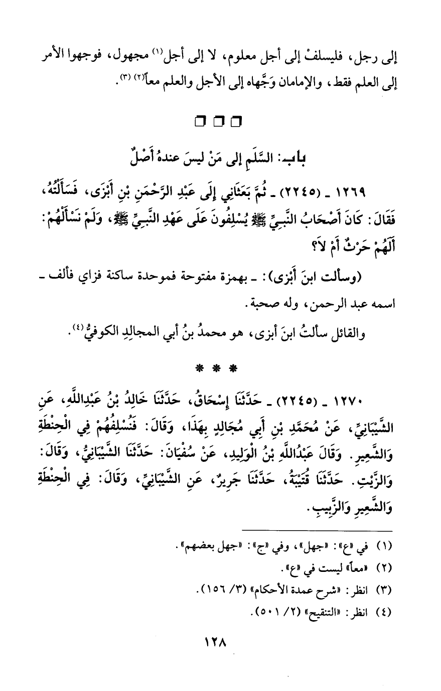 1270 - (2245) - حَدَّثَنَا إِسْحَاقُ، حَدَّثَنَا خَالِدُ بْنُ عَبْدِ اللهِ، عَنِ الشَّيْبَانِيِّ، عَنْ مُحَمَّدِ بْنِ أَبِي مُجَالِدٍ بِهَذَا، وَقَالَ: فَنُسْلِفُهُمْ فِي الْحِنْطَةِ وَالشَّعِيرِ. وَقَالَ عَبْدُ اللهِ بْنُ الْوَلِيدِ، عَنْ سُفْيَانَ: حَدَّثَنَا الشَّيْبَانِيُّ، وَقَالَ: وَالزَّيْتِ. حَدَّثَنَا قُتَيْبَةُ، حَدَّثَنَا جَرِيرٌ، عَنِ الشَّيْبَانِيِّ، وَقَالَ: فِي الْحِنْطَةِ وَالشَّعِيرِ وَالزَّبِيبِ.