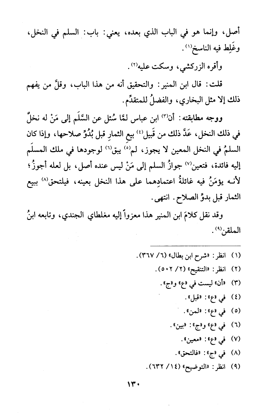 ووجه مطابقته: أن (¬3) ابن عباس لمَّا سُئل عن السَّلَم إلى مَنْ له نخلٌ في ذلك النخل، عَدَّ ذلك من قَبيل (¬4) بيعِ الثمارِ قبل بُدُوِّ صلاحها، وإذا كان السلمُ في النخل المعين لا يجوز، لم (¬5) يبق (¬6) لوجودها في ملك المسلَم إليه فائدة، فتعين (¬7) جوازُ السلم إلى مَنْ ليس عنده أصل، بل لعله أجوزُ؛ لأنه يؤمَنُ فيه غائلةُ اعتمادِهما على هذا النخل بعينه، فيلتحق (¬8) ببيع الثمار قبل بدوِّ الصلاح. انتهى.