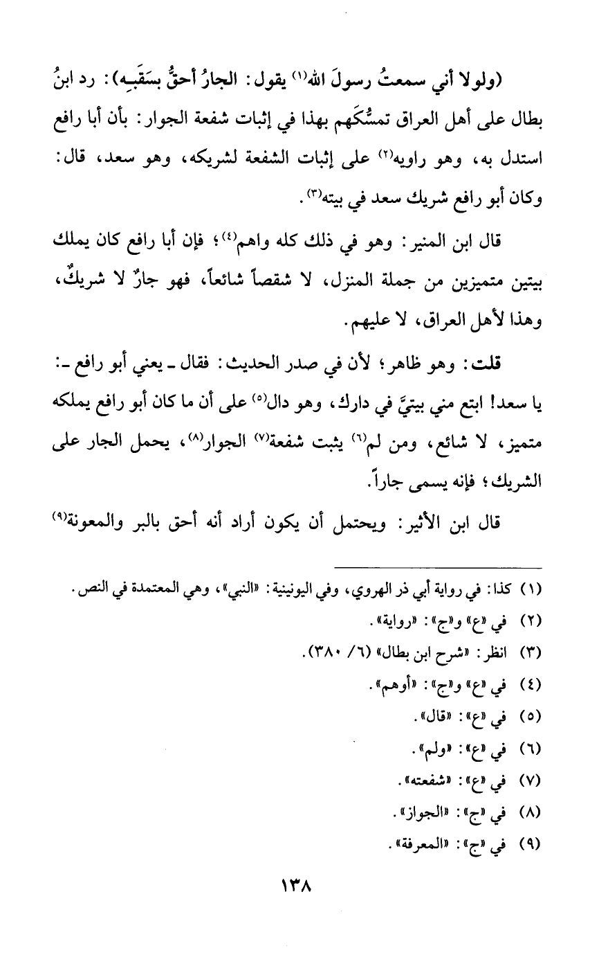 قال ابن المنير: وهو في ذلك كله واهم (¬4)؛ فإن أبا رافع كان يملك بيتين متميزين من جملة المنزل، لا شقصاً شائعاً، فهو جارٌ لا شريكٌ، وهذا لأهل العراق، لا عليهم.