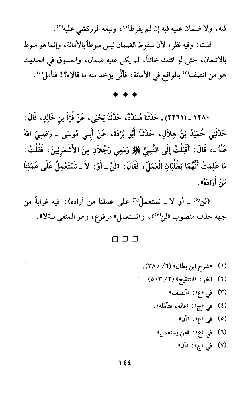 1280 - (2261) - حَدَّثَنَا مُسَدَّدٌ، حَدَّثَنَا يَحْيَى، عَنْ قُرَّةَ بْنِ خَالِدٍ، قَالَ: حَدَّثَنِي حُمَيْدُ بْنُ هِلَالٍ، حَدَّثَنَا أَبُو بُرْدَةَ، عَنْ أَبِي مُوسَى -رَضِيَ اللهُ عَنْهُ-، قَالَ: أَقْبَلْتُ إِلَى النَّبِيِّ - صلى الله عليه وسلم - وَمَعِي رَجُلَانِ مِنَ الأَشْعَرِيِّينَ، فَقُلْتُ: مَا عَلِمْتُ أَنَّهُمَا يَطْلُبَانِ الْعَمَلَ، فَقَالَ: "لَنْ -أَوْ: لَا- نَسْتَعْمِلُ عَلَى عَمَلِنَا مَنْ أَرَادَهُ".