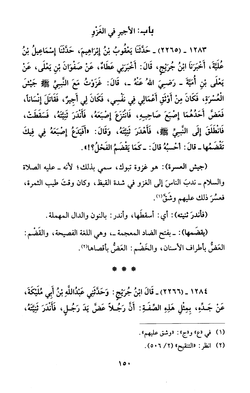 1283 - (2265) - حَدَّثَنَا يَعْقُوبُ بْنُ إِبْرَاهِيمَ، حَدَّثَنَا إِسْمَاعِيلُ بْنُ عُلَيَّةَ، أَخْبَرَنَا ابْنُ جُرَيْجٍ، قَالَ: أَخْبَرَنِي عَطَاءٌ، عَنْ صَفْوَانَ بْنِ يَعْلَى، عَنْ يَعْلَى بْنِ أُمَيَّةَ -رَضِيَ اللهُ عَنْهُ-، قَالَ: غَزَوْتُ مَعَ النَّبِيِّ - صلى الله عليه وسلم - جَيْشَ الْعُسْرَةِ، فَكَانَ مِنْ أَوْثَقِ أَعْمَالِي فِي نَفْسِي، فَكَانَ لِي أَجِيرٌ، فَقَاتَلَ إِنْسَاناً، فَعَضَّ أَحَدُهُمَا إِصْبَعَ صَاحِبِهِ، فَانْتَزَعَ إِصْبَعَهُ، فَأَنْدَرَ ثَنِيَّتَهُ، فَسَقَطَتْ، فَانْطَلَقَ إلَى النَّبِيِّ - صلى الله عليه وسلم -، فَأَهْدَرَ ثَنِيَّتَهُ، وَقَالَ: "أَفَيَدَعُ إِصْبَعَهُ فِي فِيكَ تَقْضَمُها -قالَ: أحْسبُهُ قالَ:- كَمَا يَقْضَمُ الفَحْلُ؟! ".