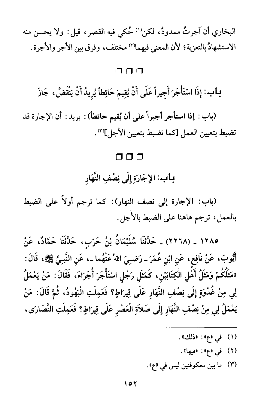 1285 - (2268) - حَدَّثَنَا سُلَيْمَانُ بْنُ حَرْبٍ، حَدَّثَنَا حَمَّادٌ، عَنْ أَيُّوبَ، عَنْ نَافِعٍ، عَنِ ابْنِ عُمَرَ -رَضِيَ اللهُ عَنْهُما-، عَنِ النَّبِيِّ - صلى الله عليه وسلم -، قَالَ: "مَثَلُكُمْ وَمَثَلُ أَهْلِ الْكِتَابَيْنِ، كمَثَلِ رَجُلٍ اسْتَأْجَرَ أُجَرَاءَ، فَقَالَ: مَنْ يَعْمَلُ لِي مِنْ غُدْوَةٍ إِلَى نِصْفِ النَّهَارِ عَلَى قِيرَاطٍ؟ فَعَمِلَتِ الْيَهُودُ، ثُمَّ قَالَ: مَنْ يَعْمَلُ لِي مِنْ نِصْفِ النَّهَارِ إِلَى صَلَاةِ الْعَصْرِ عَلَى قِيرَاطٍ؟ فَعَمِلَتِ النَّصَارَى،