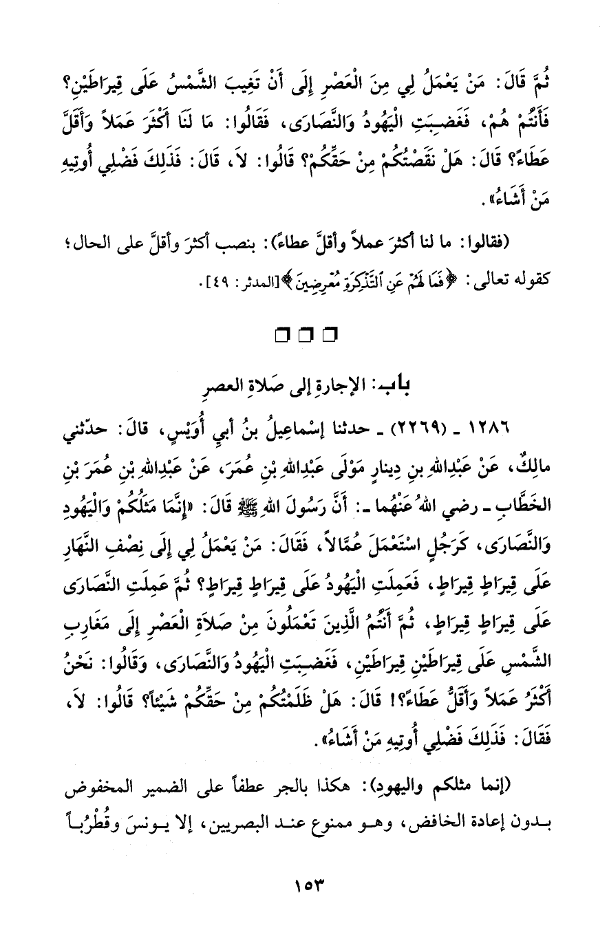 1286 - (2269) - حدثنا إسْماعِيلُ بنُ أبيِ أُوَيْسٍ، قالَ: حدّثني مالِكٌ، عَنْ عَبْدِ اللهِ بنِ دِينارٍ مَوْلَى عَبْدِ اللهِ بْنِ عُمَرَ، عَنْ عَبْدِ اللهِ بْنِ عُمَرَ بْنِ الخَطَّابِ -رضي اللهُ عَنْهُما-: أَنَّ رَسُولَ اللهِ - صلى الله عليه وسلم - قَالَ: "إِنَّمَا مَثَلُكُمْ وَالْيَهُودِ وَالنَّصَارَى، كَرَجُلٍ اسْتَعْمَلَ عُمَّالًا، فَقَالَ: مَنْ يَعْمَلُ لِي إِلَى نِصْفِ النَّهَارِ عَلَى قِيرَاطٍ قِيرَاطٍ، فَعَمِلَتِ الْيَهُودُ عَلَى قِيرَاطٍ قِيرَاطٍ؟ ثُمَّ عَمِلَتِ النَّصَارَى عَلَى قِيرَاطٍ قِيرَاطٍ، ثُمَّ أَنْتُمُ الَّذِينَ تَعْمَلُونَ مِنْ صَلَاةِ الْعَصْرِ إِلَى مَغَارِبِ الشَّمْسِ عَلَى قِيرَاطَيْنِ قِيرَاطَيْنِ، فَغَضِبَتِ الْيَهُودُ وَالنَّصَارَى، وَقَالُوا: نَحْنُ أَكْثَرُ عَمَلاً وَأَقَلُّ عَطَاءً؟! قَالَ: هَلْ ظَلَمْتُكُمْ مِنْ حَقِّكُمْ شَيْئاً؟ قَالُوا: لَا، فَقَالَ: فَذَلِكَ فَضْلِي أُوتِيهِ مَنْ أَشَاءُ".