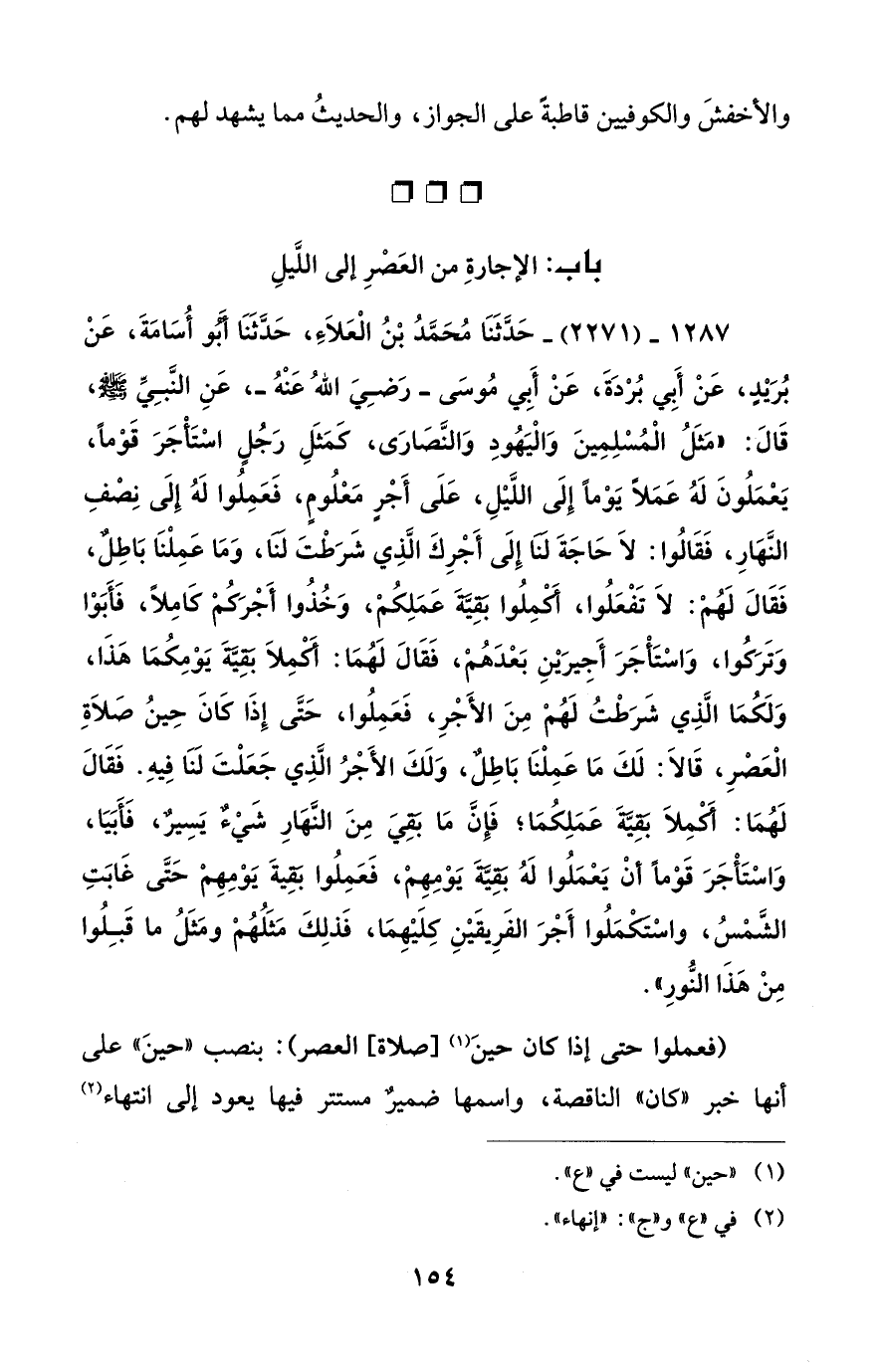 1287 - (2271) - حَدَّثَنَا مُحَمَّدُ بْنُ الْعَلَاءِ، حَدَّثَنَا أبُو أُسَامَةَ، عَنْ بُرَيْدٍ، عَنْ أَبِي بُرْدَةَ، عَنْ أَبِي مُوسَى -رَضِيَ اللهُ عَنْهُ-، عَنِ النَّبِيِّ - صلى الله عليه وسلم -، قَالَ: "مَثَلُ الْمُسْلِمِينَ وَالْيَهُودِ وَالنَّصَارَى، كَمَثَلِ رَجُلٍ اسْتَأْجَرَ قَوْماً، يَعْمَلُونَ لَهُ عَمَلاً يَوْماً إِلَى اللَّيْلِ، عَلَى أَجْرٍ مَعْلُومٍ، فَعَمِلُوا لَهُ إِلَى نِصْفِ النَّهَارِ، فَقَالُوا: لَا حَاجَةَ لَنَا إِلَى أَجْرِكَ الَّذِي شَرَطْتَ لَنَا، وَمَا عَمِلْنَا بَاطِلٌ، فَقَالَ لَهُمْ: لاَ تَفْعَلُوا، "أَكْمِلُوا بَقِيَّةَ عَمَلِكُمْ، وَخُذُوا أَجْرَكُمْ كَامِلًا، فَأَبَوْا وَتَرَكُوا، وَاسْتَأْجَرَ أَجِيرَيْنِ بَعْدَهُمْ، فَقَالَ لَهُمَا: أَكْمِلاَ بَقِيَّةَ يَوْمِكُمَا هَذَا، وَلَكُمَا الَّذِي شَرَطْتُ لَهُمْ مِنَ الأَجْرِ، فَعَمِلُوا، حَتَّى إِذَا كَانَ حِينُ صَلَاةِ الْعَصْرِ، قَالَا: لَكَ مَا عَمِلْنَا بَاطِلٌ، وَلَكَ الأَجْرُ الَّذِي جَعَلْتَ لَنَا فِيهِ. فَقَالَ لَهُمَا: أَكْمِلَا بَقِيَّةَ عَمَلِكُمَا؛ فَإِنَّ مَا بَقِيَ مِنَ النَّهَارِ شَيْءٌ يَسِيرٌ، فَأَبَيَا، وَاسْتَأْجَرَ قَوْماً أَنْ يَعْمَلُوا لَهُ بَقِيَّةَ يَوْمِهِمْ، فَعَمِلُوا بَقِيةَ يَوْمِهِمْ حَتَّى غَابَتِ الشَّمْسُ، واسْتَكْمَلُوا أَجْرَ الفَرِيقَيْنِ كِلَيْهِمَا، فَذلِكَ مَثَلُهُمْ ومَثَلُ ما قَبِلُوا مِنْ هَذَا النُّورِ".
