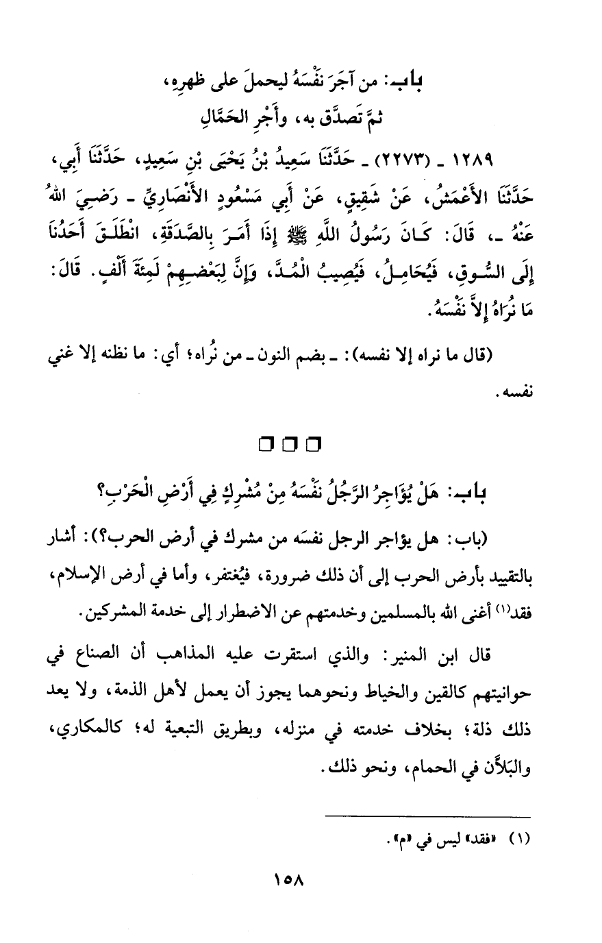 1289 - (2273) - حَدَّثَنَا سَعِيدُ بْنُ يَحْيَى بْنِ سَعِيدٍ، حَدَّثَنَا أَبِي، حَدَّثَنَا الأَعْمَشُ، عَنْ شَقِيقٍ، عَنْ أَبِي مَسْعُودٍ الأَنْصَارِيِّ -رَضِيَ اللهُ عَنْهُ-، قَالَ: كَانَ رَسُولُ اللهِ - صلى الله عليه وسلم - إِذَا أَمَرَ بِالصَّدَقَةِ، انْطَلَقَ أَحَدُنَا إِلَى الشُّوقِ، فَيُحَامِلُ، فَيُصِيبُ الْمُدَّ، وَإِنَّ لِبَعْضِهِمْ لَمِئَةَ أَلْفٍ. قَالَ: مَا نُرَاهُ إِلاَّ نَفْسَهُ.