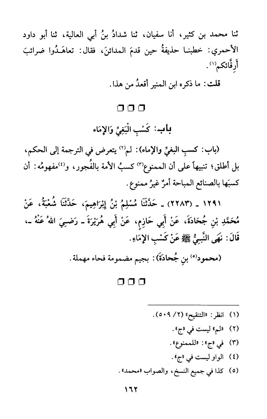 1291 - (2283) - حَدَّثَنَا مُسْلِمُ بْنُ إِبْرَاهِيمَ، حَدَّثَنَا شُعْبَةُ، عَنْ مُحَمَّدِ بْنِ جُحَادَةَ، عَنْ أَبِي حَازِمٍ، عَنْ أِبي هُرَيْرَةَ -رَضِيَ اللهُ عَنْهُ-، قَالَ: نَهَى النَّبِيُّ - صلى الله عليه وسلم - عَنْ كَسْبِ الإِمَاءِ.