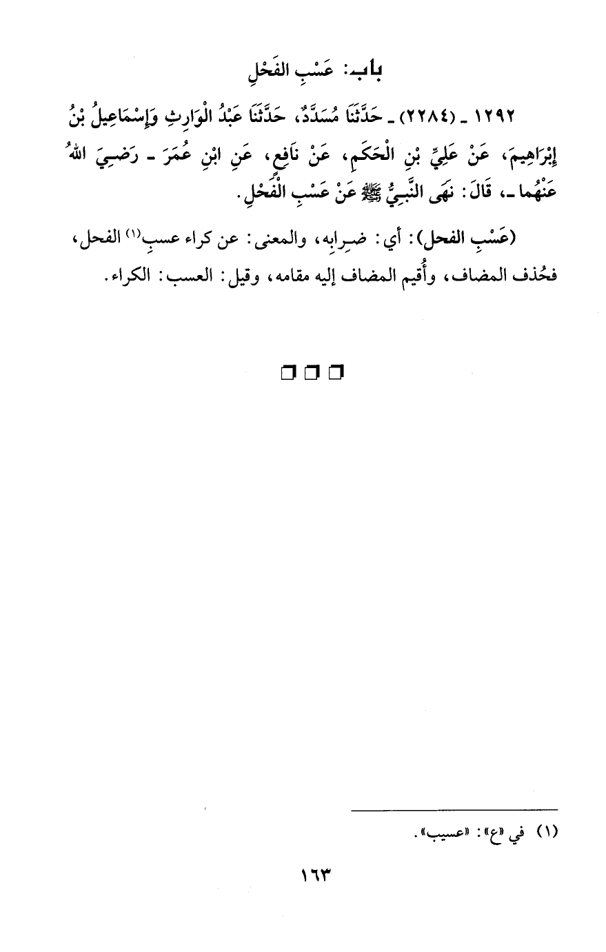 1292 - (2284) - حَدَّثَنَا مُسَدَّدٌ، حَدَّثَنَا عَبْدُ الْوَارِثِ وَإِسْمَاعِيلُ بْنُ إِبْرَاهِيمَ، عَنْ عَلِيِّ بْنِ الْحَكَمِ، عَنْ نَافِعٍ، عَنِ ابْنِ عُمَرَ -رَضِيَ اللهُ عَنْهُما-، قَالَ: نَهَى النَّبِيُّ - صلى الله عليه وسلم - عَنْ عَسْبِ الْفَحْلِ.