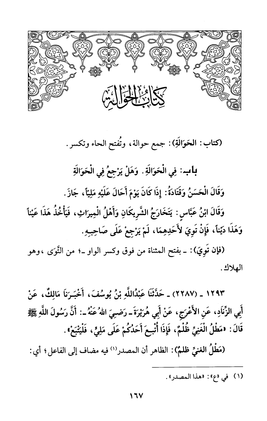 1293 - (2287) - حَدَّثَنَا عَبْدُ اللهِ بْنُ يُوسُفَ، أَخْبَرَنَا مَالِكٌ، عَنْ أَبِي الزِّنَادَ، عَنِ الأَعْرَجِ، عَنْ أَبِي هُرَيَرَةَ -رَضِيَ اللهُ عَنْهُ-: أَنَّ رَسُولَ اللهِ - صلى الله عليه وسلم - قَالَ: "مَطْلُ الْغَنِيِّ ظُلْمٌ، فَإِذَا أُتْبِعَ أَحَدُكُمْ عَلَى مَلِيٍّ، فَلْيَتْبَعْ".