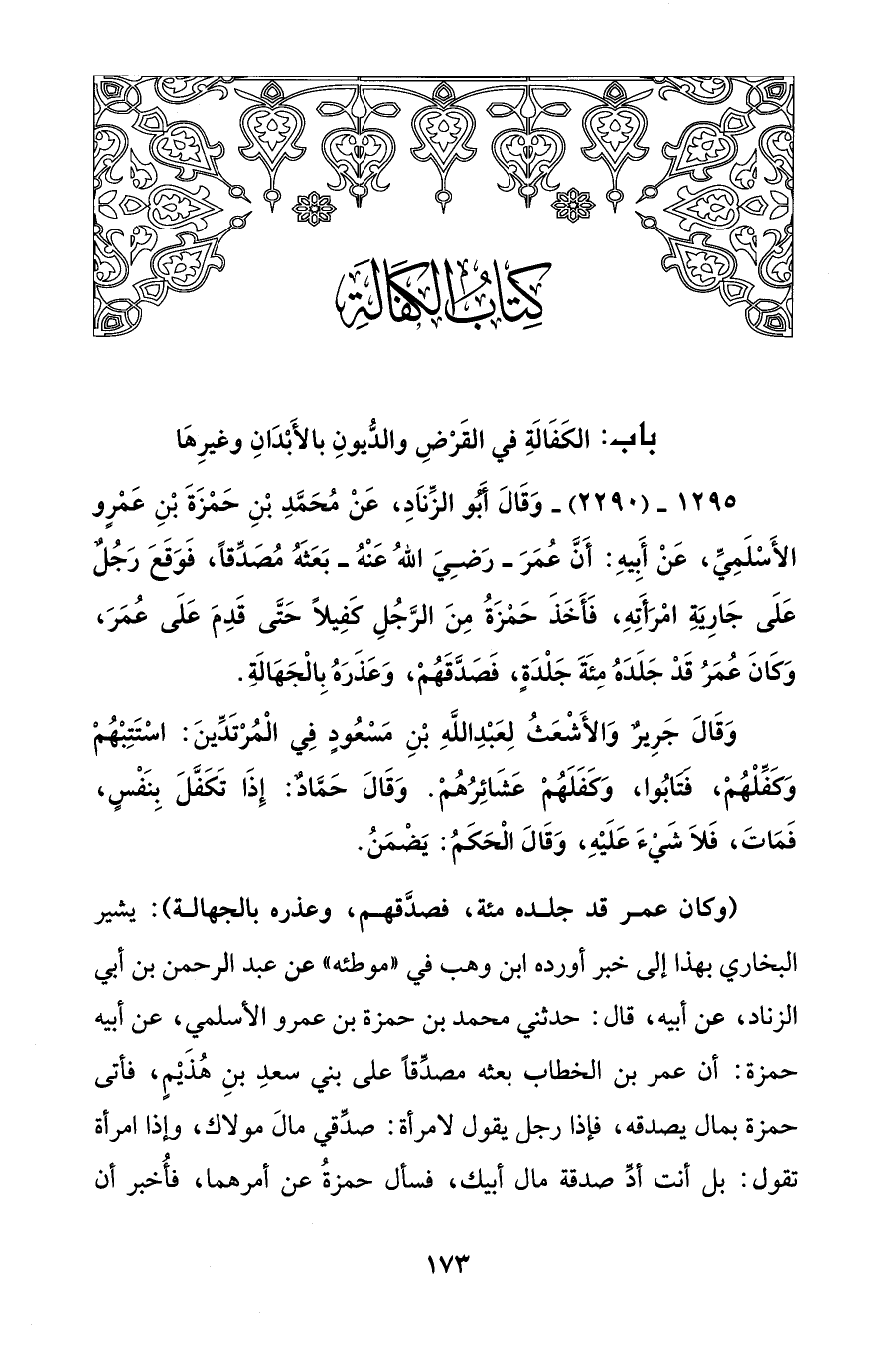 1295 - (2290) - وَقَالَ أَبُو الزِّنَادِ، عَنْ مُحَمَّدِ بْنِ حَمْزَةَ بْنِ عَمْرٍو الأَسْلَمِيِّ، عَنْ أَبِيهِ: أَنَّ عُمَرَ -رَضِيَ اللهُ عَنْهُ- بَعَثَهُ مُصَدِّقًا، فَوَقَعَ رَجُلٌ عَلَى جَارِيَةِ امْرَأَتِهِ، فَأَخَذَ حَمْزَةُ مِنَ الرَّجُلِ كَفِيلاً حَتَّى قَدِمَ عَلَى عُمَرَ، وَكَانَ عُمَرُ قَدْ جَلَدَهُ مِئَةَ جَلْدَةٍ، فَصَدَّقَهُمْ، وَعَذَرَهُ بِالْجَهَالَةِ.