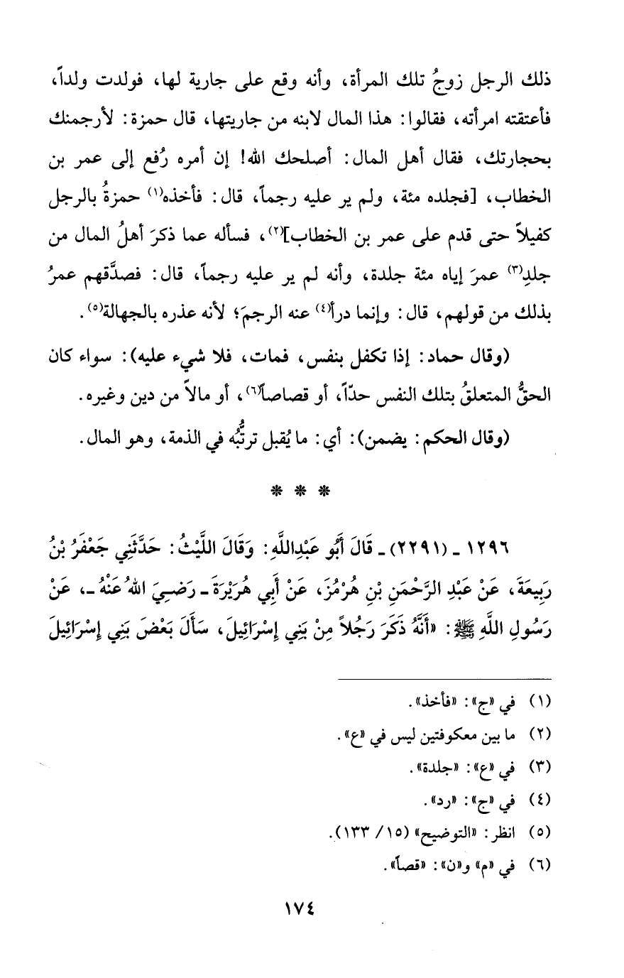 ذلك الرجل زوجُ تلك المرأة، وأنه وقع على جارية لها، فولدت ولداً، فأعتقته امرأته، فقالوا: هذا المال لابنه من جاريتها، قال حمزة: لأرجمنك بحجارتك، فقال أهل المال: أصلحك الله! إن أمره رُفع إلى عمر بن الخطاب، [فجلده مئة، ولم يحيى عليه رجماً، قال: فأخذه (¬1) حمزةُ بالرجل كفيلاً حتى قدم على عمر بن الخطاب] (¬2)، فسأله عما ذكرَ أهلُ المال من جلدِ (¬3) عمرَ إياه مئة جلدة، وأنه لم ير عليه رجماً، قال: فصدَّقهم عمرُ بذلك من قولهم، قال: وإنما درأ (¬4) عنه الرجمَ؛ لأنه عذره بالجهالة (¬5).