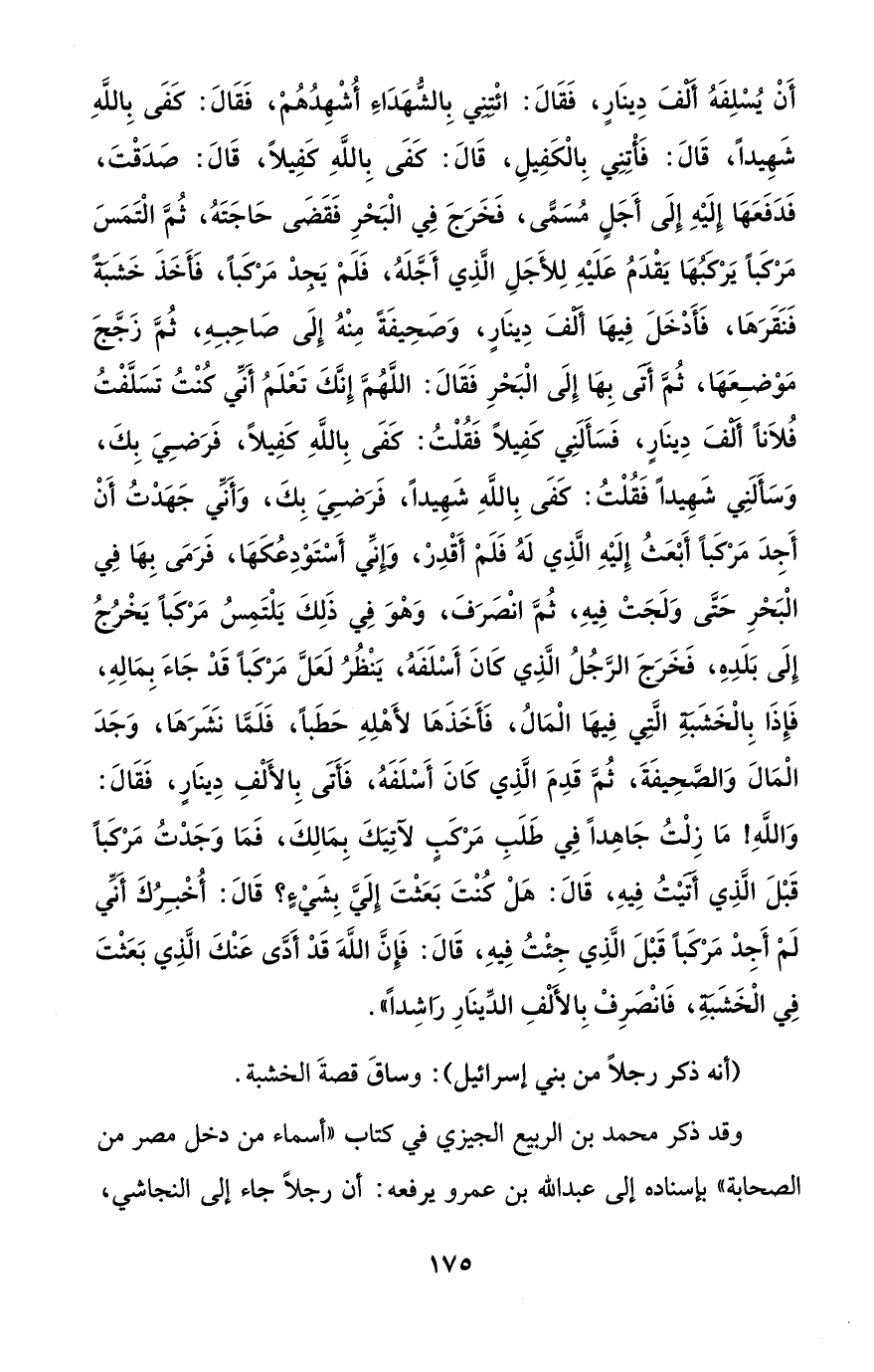 أَنْ يُسْلِفَهُ أَلْفَ دِينَارٍ، فَقَالَ: ائْتِنِي بِالشُّهَدَاءَ أُشْهِدُهُمْ، فَقَالَ: كَفَى بِاللهِ شَهِيداً، قَالَ: فَأْتِنِي بِالْكَفِيلِ، قَالَ: كَفَى بِاللهِ كَفِيلاً، قَالَ: صَدَقْتَ، فَدَفَعَهَا إِلَيْهِ إِلَى أَجَلٍ مُسَمًّى، فَخَرَجَ فِي الْبَحْرِ فَقَضَى حَاجَتَهُ، ثُمَّ الْتَمَسَ مَرْكباً يَرْكَبُهَا يَقْدَمُ عَلَيْهِ لِلأَجَلِ الَّذِي أَجَّلَهُ، فَلَمْ يَجِدْ مَرْكَباً، فَأَخَذَ خَشَبَةً فَنَقَرَهَا، فَأَدْخَلَ فِيهَا أَلْفَ دِينَارٍ، وَصَحِيفَةً مِنْهُ إِلَى صَاحِبِهِ، ثُمَّ زَجَّجَ مَوْضِعَهَا، ثُمَّ أَتَى بِهَا إِلَى الْبَحْرِ فَقَالَ: اللَّهُمَّ إِنَّكَ تَعْلَمُ أَنِّي كُنْتُ تَسَلَّفْتُ فُلَاناً أَلْفَ دِينَارٍ، فَسَأَلَنِي كَفِيلاً فَقُلْتُ: كَفَى بِاللهِ كَفِيلاً، فَرَضِيَ بِكَ، وَسَأَلَنِي شَهِيداً فَقُلْتُ: كَفَى بِاللهِ شَهِيداً، فَرَضِيَ بِكَ، وَأَنِّي جَهَدْتُ أَنْ أَجِدَ مَرْكَباً أَبْعَثُ إِلَيْهِ الَّذِي لَهُ فَلَمْ أَقْدِرْ، وَإِنِّي أَسْتَوْدِعُكَهَا، فَرَمَى بِهَا فِي الْبَحْرِ حَتَّى وَلَجَتْ فِيهِ، ثُمَّ انْصَرَفَ، وَهْوَ فِي ذَلِكَ يَلْتَمِسُ مَرْكَباً يَخْرُجُ إِلَى بَلَدِهِ، فَخَرَجَ الرَّجُلُ الَّذِي كَانَ أَسْلَفَهُ، يَنْظُرُ لَعَلَّ مَرْكَباً قَدْ جَاءَ بِمَالِهِ، فَإِذَا بِالْخَشَبَةِ الَّتِي فِيهَا الْمَالُ، فَأَخَذَهَا لأَهْلِهِ حَطَباً، فَلَمَّا نَشَرَهَا، وَجَدَ الْمَالَ وَالصَّحِيفَةَ، ثُمَّ قَدِمَ الَّذِي كَانَ أَسْلَفَهُ، فَأَتَى بِالأَلْفِ دِينَارٍ، فَقَالَ: وَاللهِ! مَا زِلْتُ جَاهِداً فِي طَلَبِ مَرْكَبٍ لآتِيَكَ بِمَالِكَ، فَمَا وَجَدْتُ مَرْكَباً قَبْلَ الَّذِي أَتَيْتُ فِيهِ، قَالَ: هَلْ كُنْتَ بَعَثْتَ إِلَيَّ بِشَيْءٍ؟ قَالَ: أُخْبِرُكَ أَنِّي لَمْ أَجِدْ مَرْكَباً قَبْلَ الَّذِي جِئْتُ فِيهِ، قَالَ: فَإِنَّ اللهَ قَدْ أَدَّى عَنْكَ الَّذِي بَعَثْتَ فِي الْخَشَبَةِ، فَانْصَرِفْ بِالأَلْفِ الدِّينَارِ رَاشِداً".