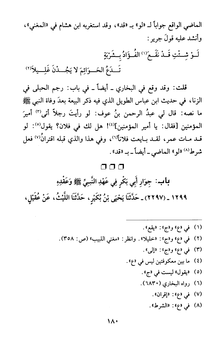 قلت: وقد وقع في البخاري -أيضاً- في باب: رجم الحبلى في الزنا، في حديث ابن عباس الطويل الذي فيه ذكر البيعة بعدَ وفاة النبي - صلى الله عليه وسلم - ما نصه: قال لي عبدُ الرحمن بنُ عوف: لو رأيتَ رجلَا أتى (¬3) أميرَ المؤمنين [فقال: يا أمير المؤمنين] (¬4)! هل لك في فلان؟ يقول (¬5): لو قد مات عمر، لقد بايعت فلاناً (¬6)، وفي هذا والذي قبله اقترانُ (¬7) فعل شرط (¬8) "لو" الماضي -أيضاً- بـ "قد".