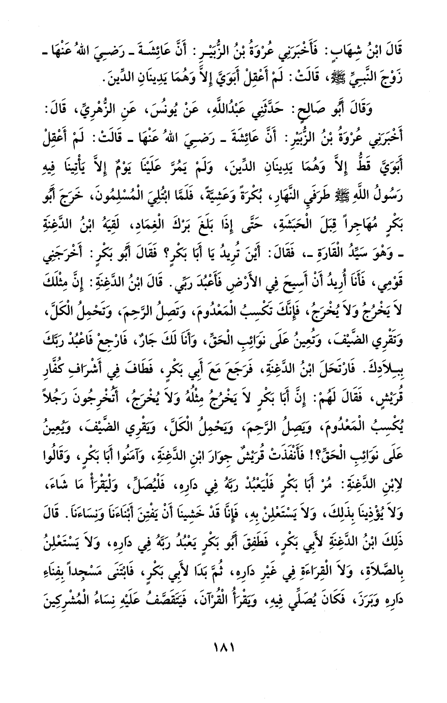 وَقَالَ أَبُو صَالِحٍ: حَدَّثَنِي عَبْدُ اللهِ، عَنْ يُونُسَ، عَنِ الزُّهْرِيِّ، قَالَ: أَخْبَرَنِي عُرْوَةُ بْنُ الزُّبَيْرِ: أَنَّ عَائِشَةَ -رَضِيَ اللهُ عَنْهَا- قَالَتْ: لَمْ أَعْقِلْ أَبَوَيَّ قَطُّ إِلاَّ وَهُمَا يَدِينَانِ الدِّينَ، وَلَمْ يَمُرَّ عَلَيْنَا يَوْمٌ إِلاَّ يَأْتِينَا فِيهِ رَسُولُ اللهِ - صلى الله عليه وسلم - طَرَفَيِ النَّهَارِ، بُكْرَةً وَعَشِيَّهً، فَلَمَّا ابْتُلِيَ الْمُسْلِمُونَ، خَرَجَ أَبُو بَكْرٍ مُهَاجِراً قِبَلَ الْحَبَشَةِ، حَتَّى إِذَا بَلَغَ بَرْكَ الْغِمَادِ، لَقِيَهُ ابْنُ الدَّغِنَةِ -وَهْوَ سَيِّدُ الْقَارَةِ-، فَقَالَ: أَيْنَ تُرِيدُ يَا أَبَا بَكْرٍ؟ فَقَالَ أَبُو بَكْرٍ: أَخْرَجَنِي قَوْمِي، فَأَنَا أُرِيدُ أَنْ أَسِيحَ فِي الأَرْضِ فَأَعْبُدَ رَبِّي. قَالَ ابْنُ الدَّغِنَةِ: إِنَّ مِثْلَكَ لَا يَخْرُجُ وَلَا يُخْرَجُ، فَإِنَّكَ تَكْسِبُ الْمَعْدُومَ، وَتَصِلُ الرَّحِمَ، وَتَحْمِلُ الْكَلَّ، وَتَقْرِي الضَّيْفَ، وَتُعِينُ عَلَى نَوَائِبِ الْحَقِّ، وَأَنَا لَكَ جَارٌ، فَارْجِعْ فَاعْبُدْ رَبَّكَ بِبِلَادِكَ. فَارْتَحَلَ ابْنُ الدَّغِنَةِ، فَرَجَعَ مَعَ أَبِي بَكْرٍ، فَطَافَ فِي أَشْرَافِ كُفَّارِ قُرَيْشٍ، فَقَالَ لَهُمْ: إِنَّ أَبَا بَكْرٍ لَا يَخْرُجُ مِثْلُهُ وَلَا يُخْرَجُ، أَتُخْرِجُونَ رَجُلًا يُكْسِبُ الْمَعْدُومَ، وَيَصِلُ الرَّحِمَ، وَيَحْمِلُ الْكَلَّ، وَيَقْرِي الضَّيْفَ، وَيُعِينُ عَلَى نَوَائِبِ الْحَقِّ؟! فَأَنْفَذَتْ قُرَيْشٌ جِوَارَ ابْنِ الدَّغِنَةِ، وَآمَنُوا أَبَا بَكْرٍ، وَقَالُوا لاِبْنِ الدَّغِنَةِ: مُرْ أَبَا بَكْرٍ فَلْيَعْبُدْ رَبَّهُ فِي دَارِهِ، فَلْيُصَلِّ، وَلْيَقْرَأْ مَا شَاءَ، وَلاَ يُؤْذِينَا بِذَلِكَ، وَلَا يَسْتَعْلِنْ بِهِ، فَإِنَّا قَدْ خَشِينَا أَنْ يَفْتِنَ أَبْنَاءَنَا وَنِسَاءَنَا. قَالَ ذَلِكَ ابْنُ الدَّغِنَةِ لأَبِي بَكْرٍ، فَطَفِقَ أَبُو بَكْرٍ يَعْبُدُ رَبَّهُ فِي دَارِهِ، وَلَا يَسْتَعْلِنُ بِالصَّلَاةِ، وَلَا الْقِرَاءَةِ فِي غَيْرِ دَارِهِ، ثُمَّ بَدَا لأَبِي بَكْرٍ، فَابْتَنَى مَسْجِداً بِفِنَاءِ دَارِهِ وَبَرَزَ، فَكَانَ يُصَلِّي فِيهِ، وَيَقْرَأُ الْقُرْآنَ، فَيَتَقَصَّفُ عَلَيْهِ نِسَاءُ الْمُشْرِكِينَ