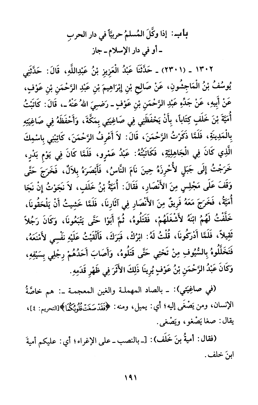 1302 - (2301) - حَدَّثَنَا عَبْدُ الْعَزِيزِ بْنُ عَبْدِ اللهِ، قَالَ: حَدَّثَنِي يُوسُفُ بْنُ الْمَاجِشُونِ، عَنْ صَالِحِ بْنِ إِبْرَاهِيمَ بْنِ عَبْدِ الرَّحْمَنِ بْنِ عَوْفٍ، عَنْ أَبِيهِ، عَنْ جَدِّهِ عَبْدِ الرَّحْمَنِ بْنِ عَوْفٍ -رَضِيَ اللهُ عَنْهُ-، قَالَ: كَاتَبْتُ أُمَيَّهَ بْنَ خَلَفٍ كِتَاباً، بِأَنْ يَحْفَظَنِي فِي صَاغِيَتِي بِمَكَّةَ، وَأَحْفَظَهُ فِي صَاغِيَتِهِ بِالْمَدِينَةِ، فَلَمَّا ذَكَرْتُ الرَّحْمَنَ، قَالَ: لَا أَعْرِفُ الرَّحْمَنَ، كَاتِبْنِي بِاسْمِكَ الَّذِي كَانَ فِي الْجَاهِلِيَّةِ، فَكَاتَبْتُهُ: عَبْدُ عَمْرٍو، فَلَمَّا كَانَ فِي يَوْمِ بَدْرٍ، خَرَجْتُ إِلَى جَبَلٍ لأُحْرِزَهُ حِينَ نَامَ النَّاسُ، فَأَبْصَرَهُ بِلَالٌ، فَخَرَجَ حَتَّى وَقَفَ عَلَى مَجْلِسٍ مِنَ الأَنْصَارِ، فَقَالَ: أُمَيَّةُ بْنُ خَلَفٍ، لَا نَجَوْتُ إِنْ نَجَا أُمَيَةُ، فَخَرَجَ مَعَهُ فَرِيقٌ مِنَ الأَنْصَارِ فِي آثَارِنَا، فَلَمَّا خَشِيتُ أَنْ يَلْحَقُونَا، خَلَّفْتُ لَهُمُ ابْنَهُ لأَشْغَلَهُمْ، فَقَتَلُوهُ، ثُمَّ أَبَوْا حَتَّى يَتْبَعُونَا، وَكَانَ رَجُلاً ثَقِيلاً، فَلَمَّا أَدْرَكُونَا، قُلْتُ لَهُ: ابْرُكْ، فَبَرَكَ، فَأَلْقَيْتُ عَلَيْهِ نَفْسِي لأَمْنَعَهُ، فَتَخَلَّلُوهُ بِالسُّيُوفِ مِنْ تَحْتِي حَتَّى قَتَلُوهُ، وَأَصَابَ أَحَدُهُمْ رِجْلِي بِسَيْفِهِ، وَكَانَ عَبْدُ الرَّحْمَنِ بْنُ عَؤفٍ يُرِينَا ذَلِكَ الأَثَرَ فِي ظَهْرِ قَدَمِهِ.