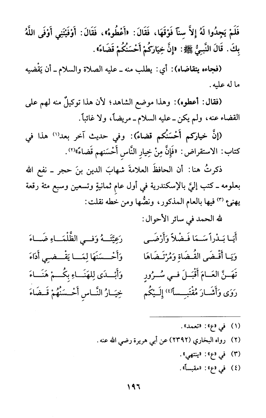 رَوَى وَأَشَارَ مُقْتَبِساً (¬4) إِلَيْكُم ... خِيَارُ النَّاسِ أَحْسَنُهُمْ قَضَاءَ