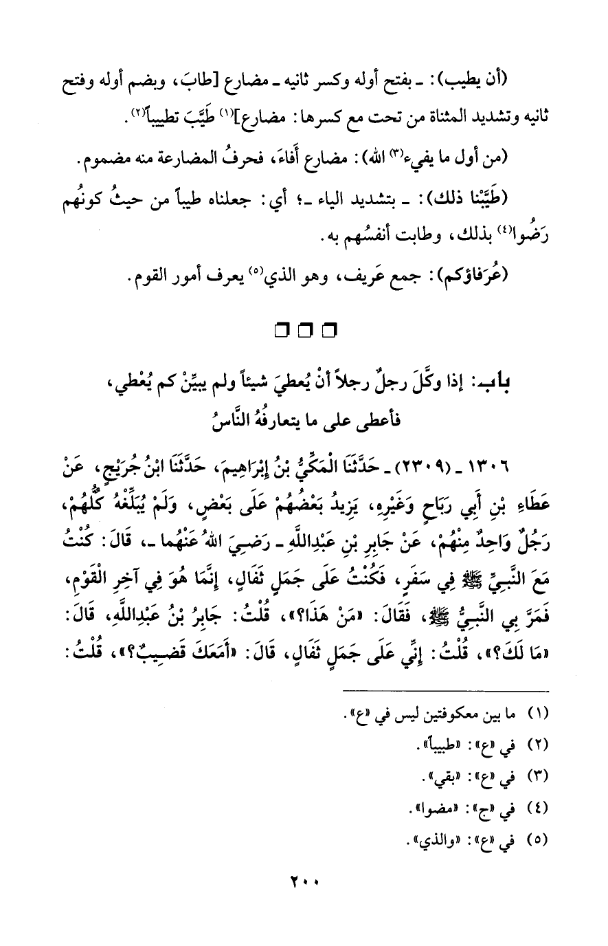 1306 - (2309) - حَدَّثَنَا الْمَكِّيُّ بْنُ إِبْرَاهِيمَ، حَدَّثَنَا ابْنُ جُرَيْجٍ، عَنْ عَطَاءِ بْنِ أَبِي رَبَاحٍ وَغَيْرِهِ، يَزِيدُ بَعْضُهُمْ عَلَى بَعْضٍ، وَلَمْ يُبَلِّغْهُ كُلُّهُمْ، رَجُلٌ وَاحِدٌ مِنْهُمْ، عَنْ جَابِرِ بْنِ عَبْدِ اللهِ -رَضِيَ اللهُ عَنْهُما-، قَالَ: كُنْتُ مَعَ النَّبِيِّ - صلى الله عليه وسلم - فِي سَفَرٍ، فَكُنْتُ عَلَى جَمَلٍ ثَفَالٍ، إِنَّمَا هُوَ فِي آخِرِ الْقَوْمِ، فَمَرَّ بِي النَّبِيُّ - صلى الله عليه وسلم -، فَقَالَ: "مَنْ هَذَا؟ "، قُلْتُ: جَابِرُ بْنُ عَبْدِ اللهِ، قَالَ: "مَا لَكَ؟ "، قُلْتُ: إِنِّي عَلَى جَمَلٍ ثَفَالٍ، قَالَ: "أَمَعَكَ قَضِيبٌ؟ "، قُلْتُ: