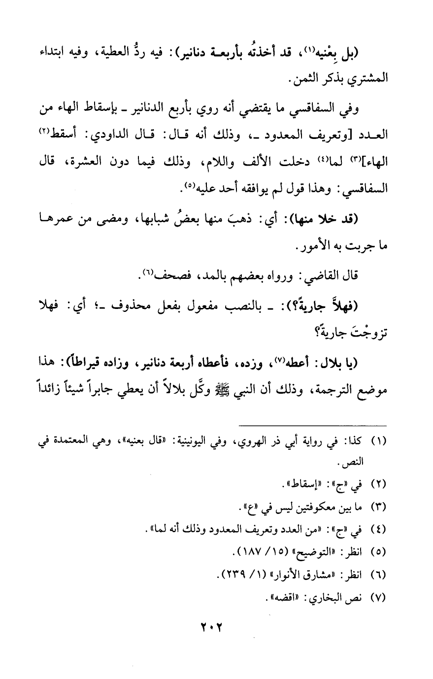 وفي السفاقسي ما يقتضي أنه روي بأربع الدنانير -بإسقاط الهاء من العدد [وتعريف المعدود-، وذلك أنه قال: قال الداودي: أسقط (¬2) الهاء] (¬3) لما (¬4) دخلت الألف واللام، وذلك فيما دون العشرة، قال السفاقسي: وهذا قول لم يوافقه أحد عليه (¬5).