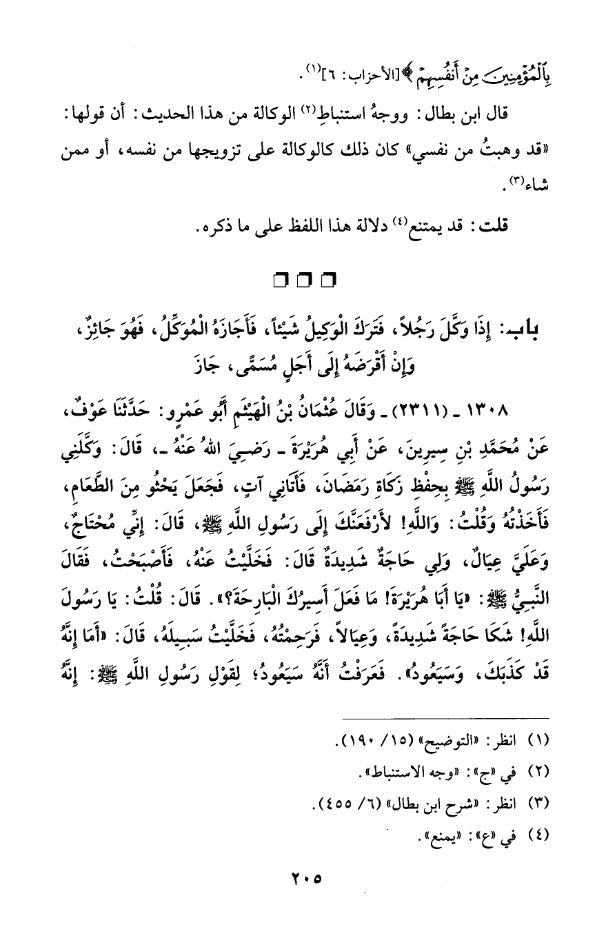 1308 - (2311) - وَقَالَ عُثْمَانُ بْنُ الْهَيْثَمِ أَبُو عَمْرٍو: حَدَّثَنَا عَوْفٌ، عَنْ مُحَمَّدِ بْنِ سِيرِينَ، عَنْ أَبِي هُرَيْرَةَ -رَضِيَ اللهُ عَنْهُ-، قَالَ: وَكَّلَنِي رَسُولُ اللهِ - صلى الله عليه وسلم - بِحِفْظِ زَكَاةِ رَمَضَانَ، فَأَتَانِي آتٍ، فَجَعَلَ يَحْثُو مِنَ الطَّعَامِ، فَأَخَذْتُهُ وَقُلْتُ: وَاللهِ! لأَرْفَعَنَّكَ إِلَى رَسُولِ اللهِ - صلى الله عليه وسلم -، قَالَ: إِنَّي مُحْتَاجٌ، وَعَلَيَّ عِيَالٌ، وَلِي حَاجَةٌ شَدِيدَةٌ قَالَ: فَخَلَّيْتُ عَنْهُ، فَأَصْبَحْتُ، فَقَالَ النَّبِيُّ - صلى الله عليه وسلم -: "يَا أَبَا هُرَيْرَةَ! مَا فَعَلَ أَسِيرُكَ الْبَارِحَةَ؟ ". قَالَ: قُلْتُ: يَا رَسُولَ اللهِ! شَكَا حَاجَةً شَدِيدَةً، وَعِيَالًا، فَرَحِمْتُهُ، فَخَلَّيْتُ سَبِيلَهُ، قَالَ: "أَمَا إِنَّهُ قَدْ كَذَبَكَ، وَسَيَعُودُ". فَعَرَفْتُ أَنَّهُ سَيَعُودُ؛ لِقَوْلِ رَسُولِ اللهِ - صلى الله عليه وسلم -: إِنَّهُ
