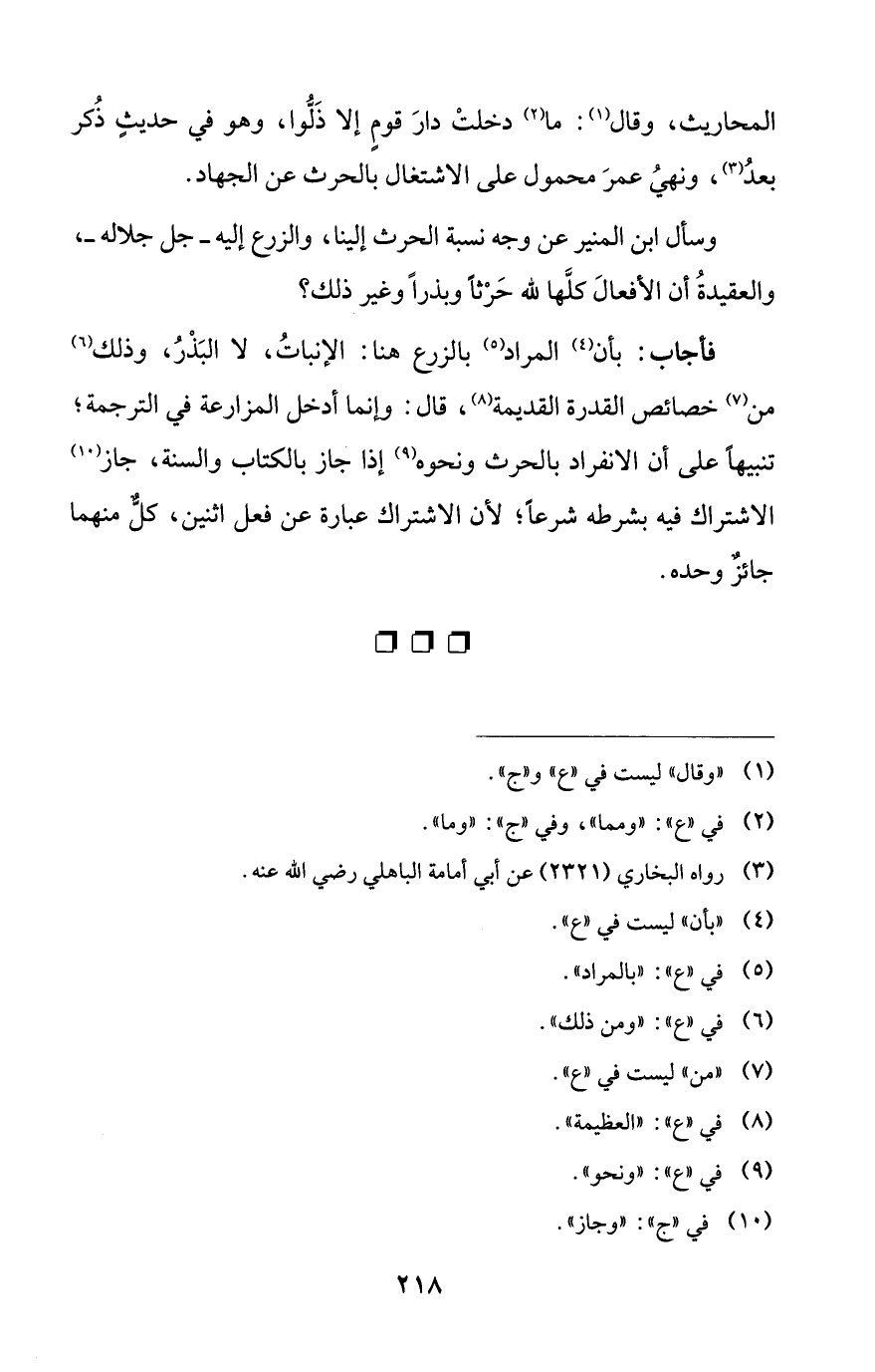 وسأل ابن المنير عن وجه نسبة الحرث إلينا، والزرع إليه -جل جلاله-، والعقيدةُ أن الأفعالَ كلَّها لله حَرْثاً وبذراً وغير ذلك؟