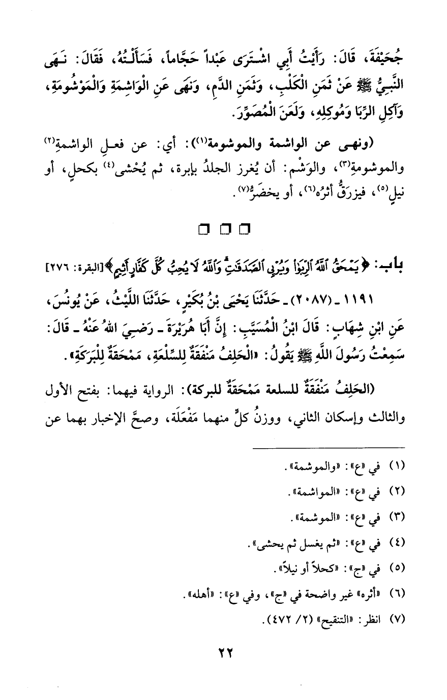 جُحَيْفَةَ، قَالَ: رَأَيْتُ أَبِي اشْتَرَى عَبْدًا حَجَّامًا، فَسَأَلْتُهُ، فَقَالَ: نَهَى النَّبِيُّ - صلى الله عليه وسلم - عَنْ ثَمَنِ الْكَلْبِ، وَثَمَنِ الدَّمِ، وَنهى عَنِ الْوَاشِمَةِ وَالْمَوْشُومَةِ، وَآكِلِ الرِّبَا وَمُوكلِهِ، وَلَعَنَ الْمُصَوَّرَ.
